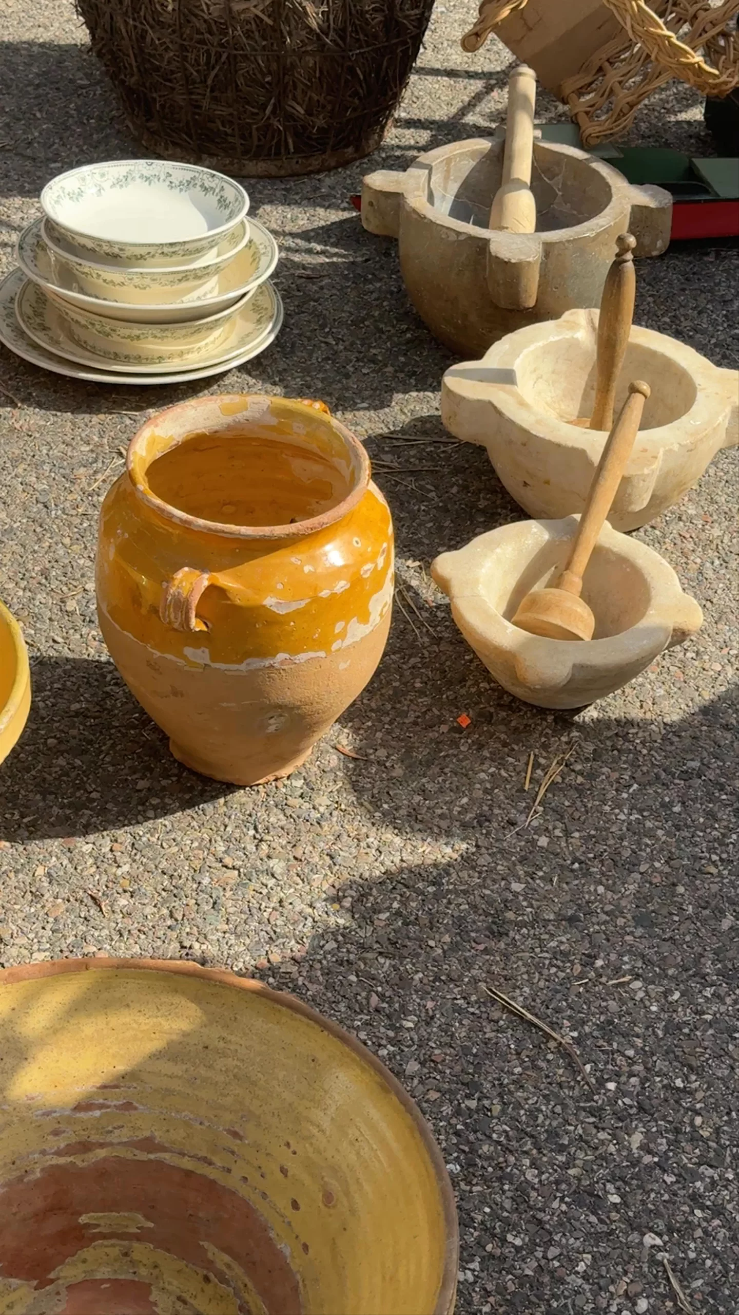 This vintage yellow confit pot is a true piece of French culinary history. In the days before refrigeration, French kitchens relied on these pots to preserve meats like duck and goose, a method known as 'confit.' The top half is glazed in a rich yellow, while the bottom remains unglazed - a design that allowed the pot to be partially buried in cool earth, keeping its contents fresh. Its chips and imperfections are badges of honor, telling tales of bustling kitchens. Sylvie loves it perched on a shelf holding fresh herbs or as a centerpiece on your dining table. Exactly as pictured.