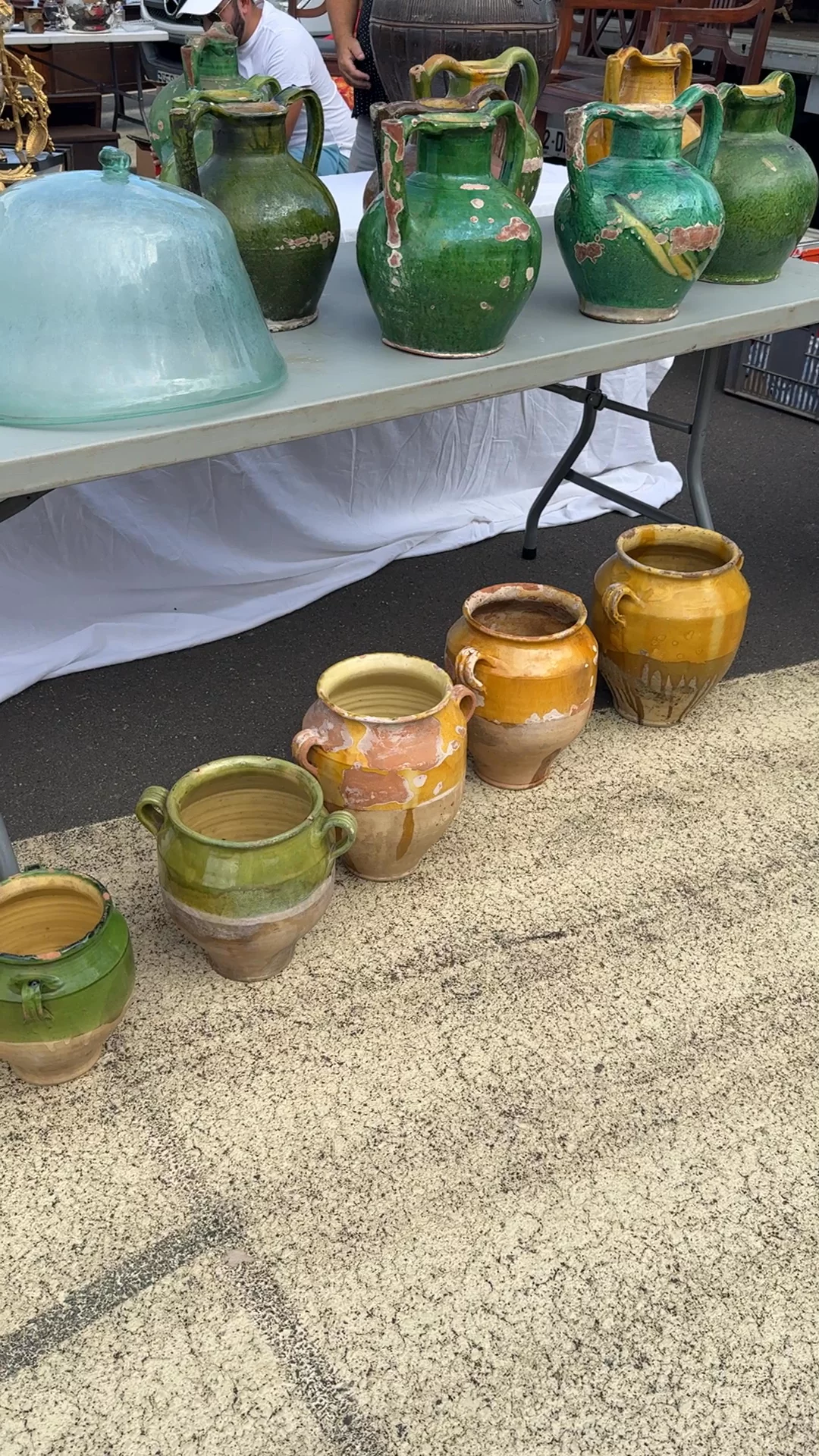 Extra Large confit pots? Yes you heard right. Very rare and extremely beautiful! These vintage yellow confit pot are a true piece of French culinary history. In the days before refrigeration, French kitchens relied on these pots to preserve meats like duck and goose, a method known as 'confit.' The top half is glazed in a rich yellow, while the bottom remains unglazed - a design that allowed the pot to be partially buried in cool earth, keeping its contents fresh. Their chips and imperfections are badges of honor, telling tales of bustling kitchens. Sylvie loves them perched on a shelf holding fresh herbs or as a centerpiece on your dining table. Expect variations in patina, chips, cracks and shades of yellow and ochre, but rest assured, we only bring our favorites back from France.