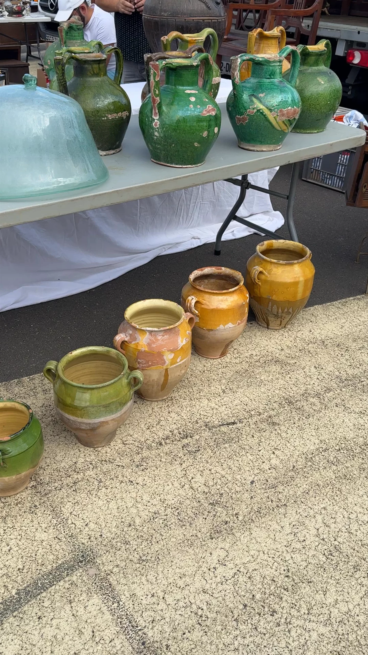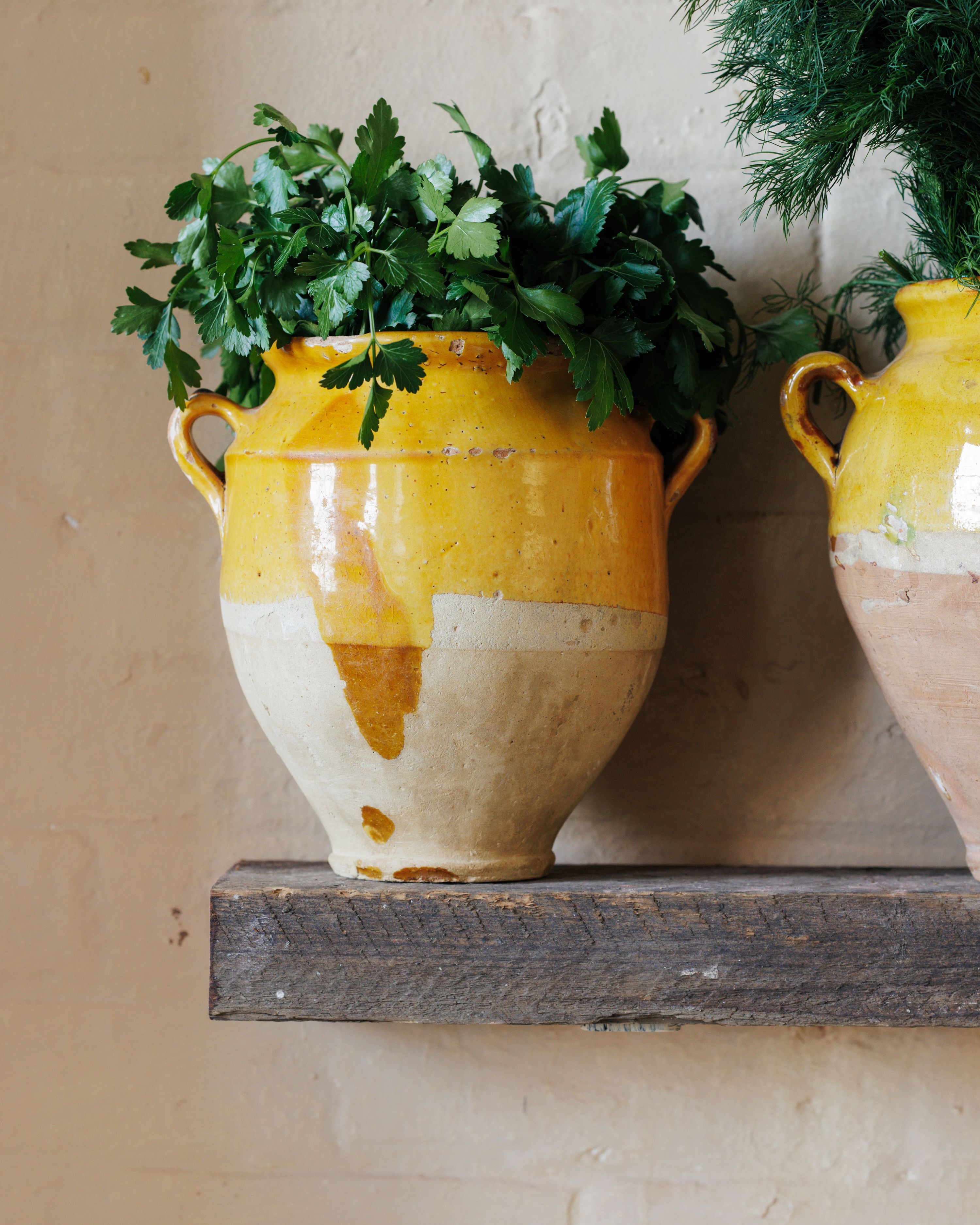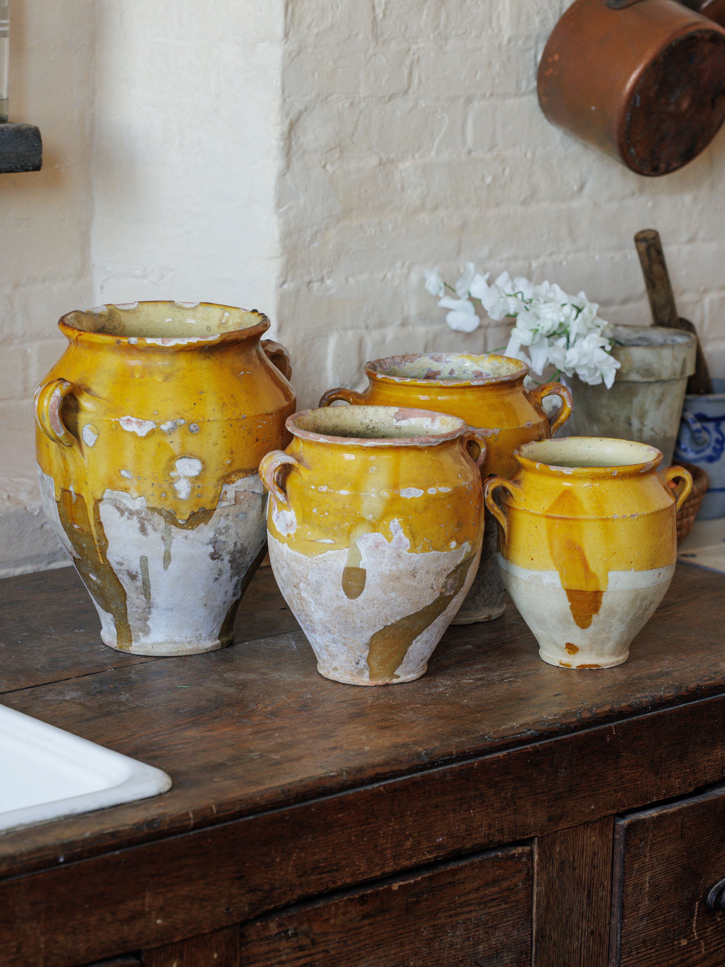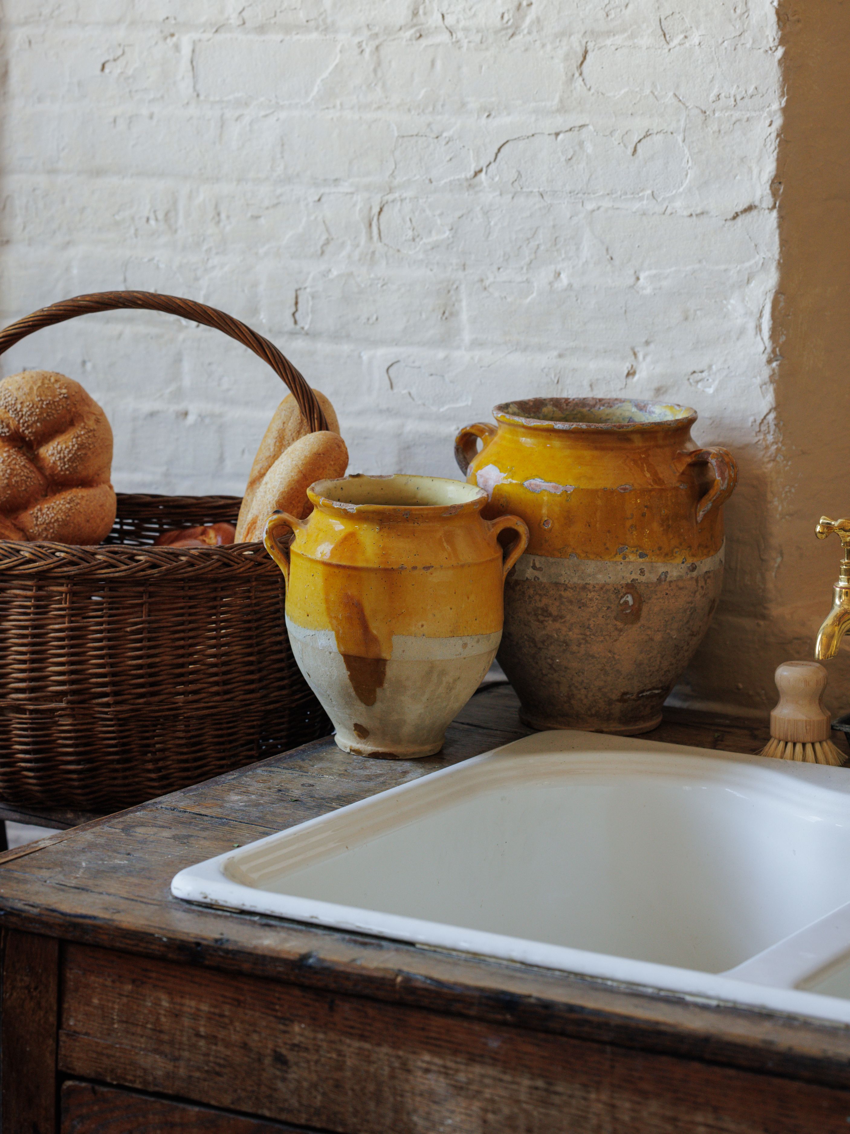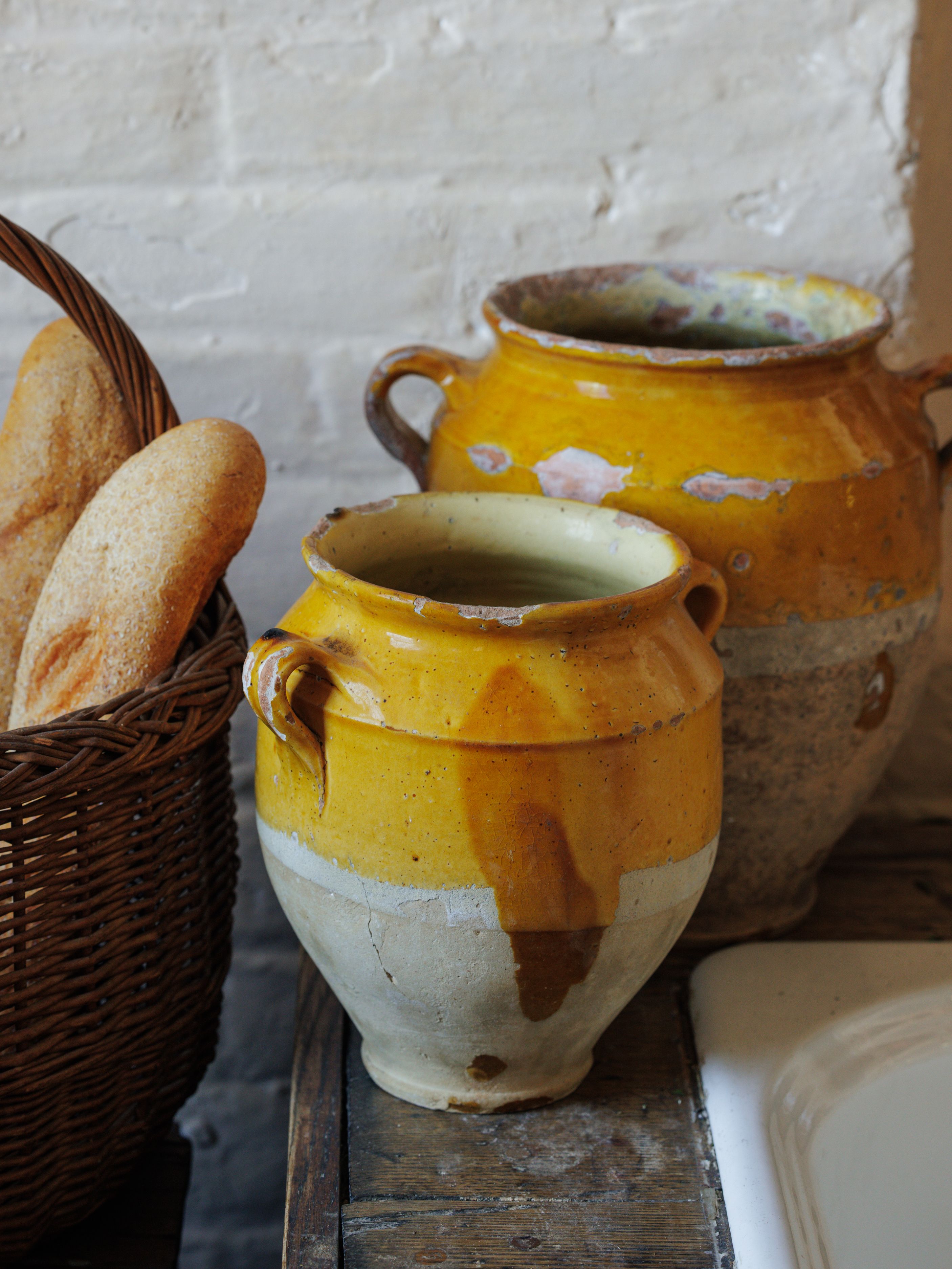 A stunning rare antique mistake, now you're new favorite vessel! These vintage yellow confit pot are a true piece of French culinary history. In the days before refrigeration, French kitchens relied on these pots to preserve meats like duck and goose, a method known as 'confit.' The top half is glazed in a rich yellow, while the bottom remains unglazed - a design that allowed the pot to be partially buried in cool earth, keeping its contents fresh. Their chips and imperfections are badges of honor, telling tales of bustling kitchens. Sylvie loves them perched on a shelf holding fresh herbs or as a centerpiece on your dining table. Exactly as pictured.
