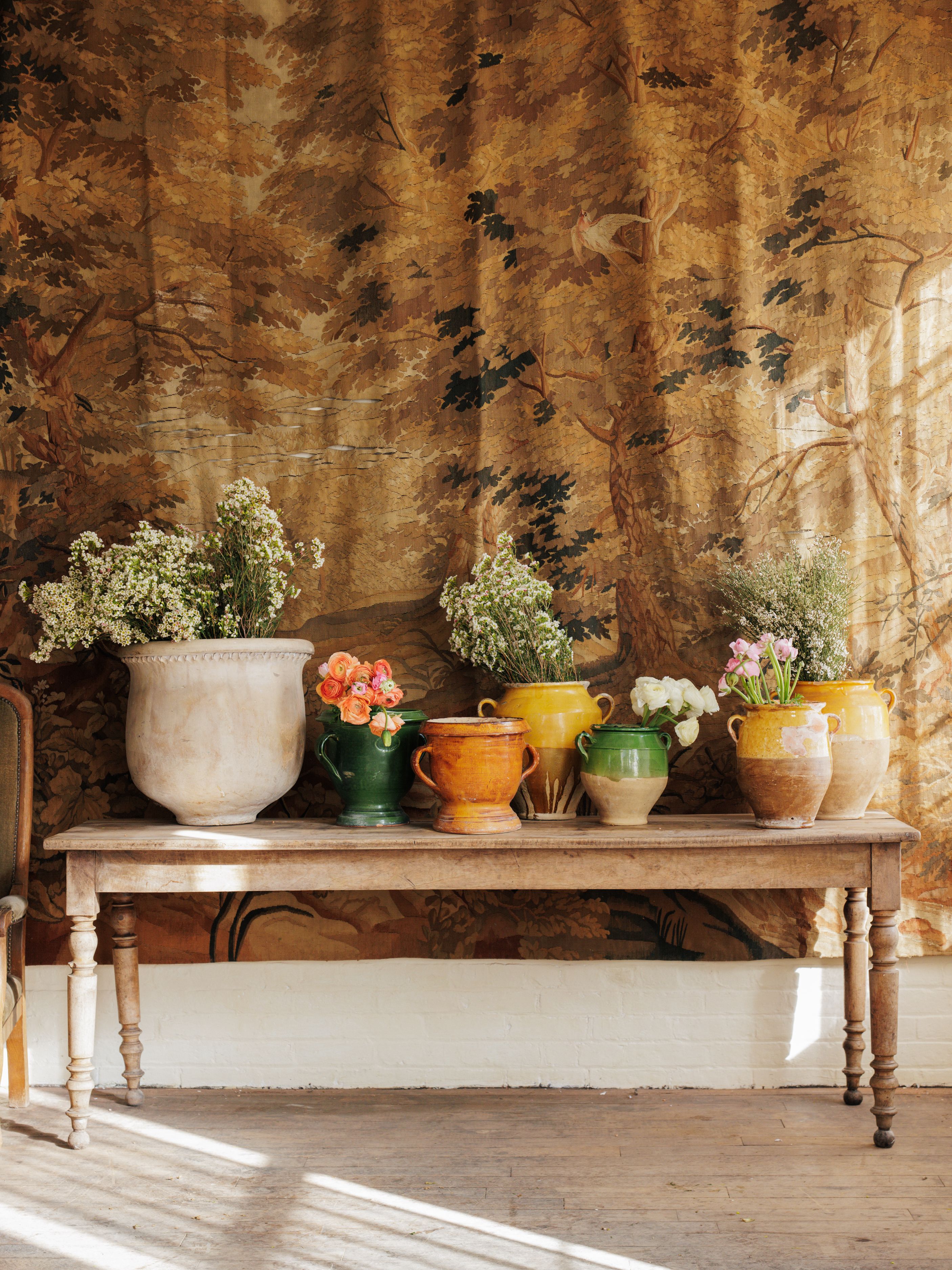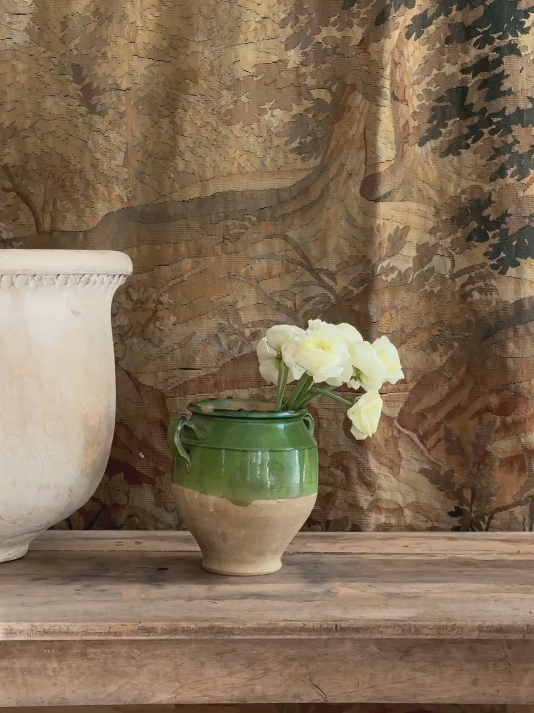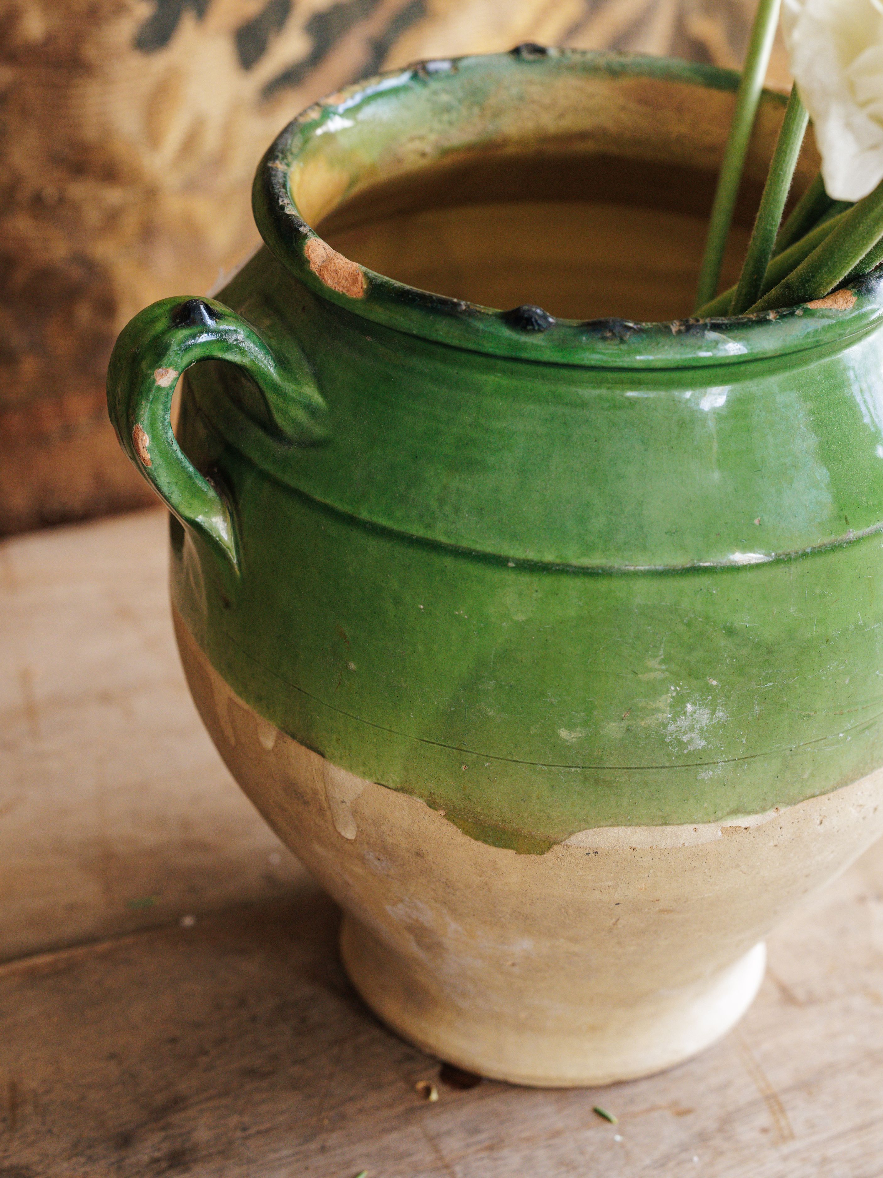 Lets get one thing out of the way first, green confit pots are the rarest of them all. Once upon a time, in old and busy French kitchens, confit pots were essential for preserving rich foods like duck confit, this pot features a half-green glazed exterior and unglazed bottom, perfect for covering in fabric and burying in cool cellars or the ground. These pots are becoming harder to find, and are often thought to be the king of all the antique french kitchen pots. Today, these charming pots are a welcomed addition to your kitchen window sills or playing the main characters on your dining, coffee, or entryway tables.
