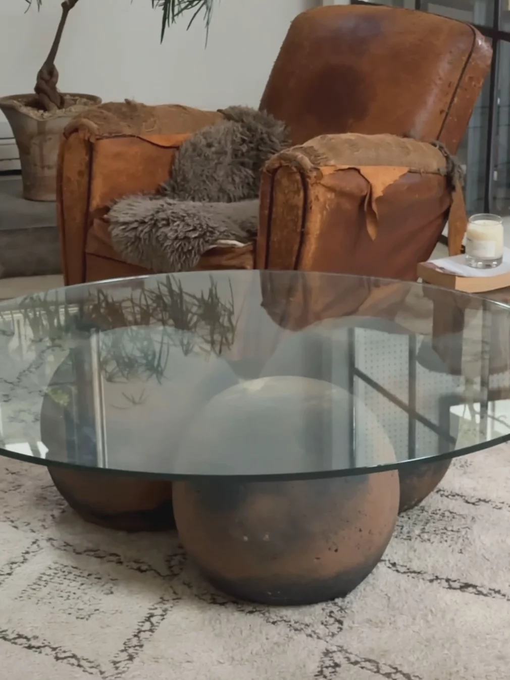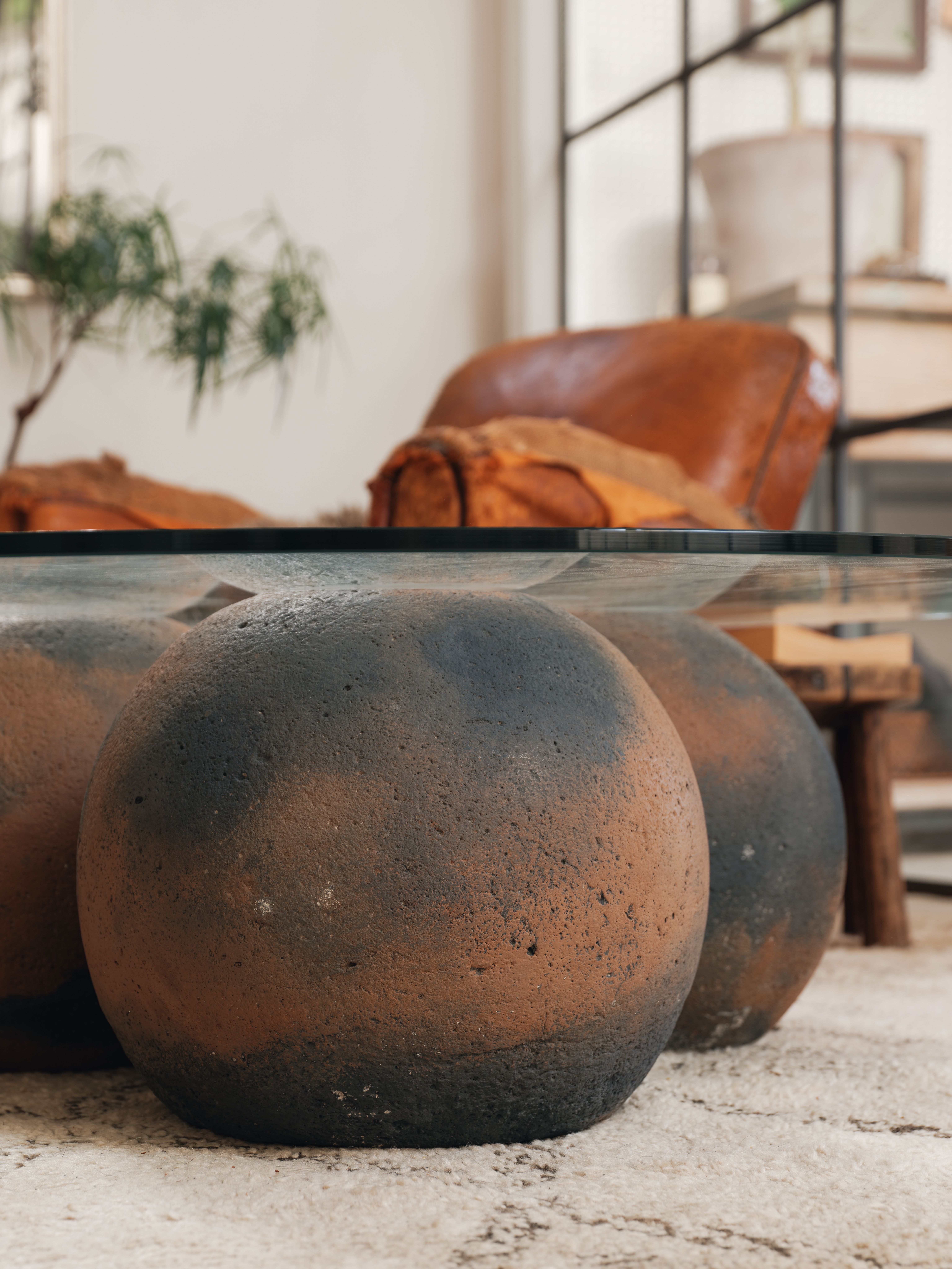 This limestone coffee table, sourced from Indonesia, was designed exclusively by Berbere Imports. Its sculptural base, crafted from natural limestone with a custom finish, is a true conversation starter. Paired with a sleek glass top, it's perfect to create intrigue in an organic home.
