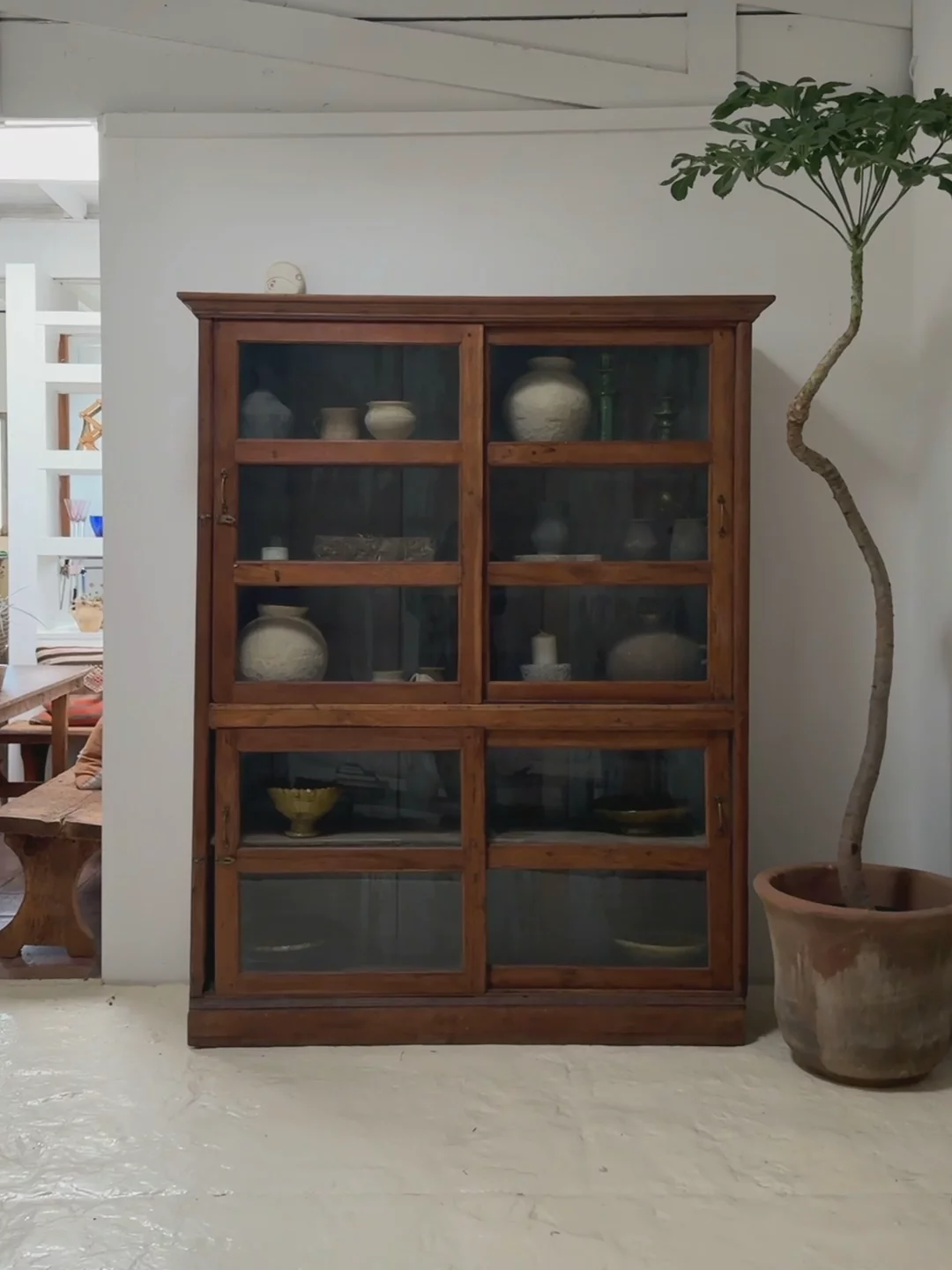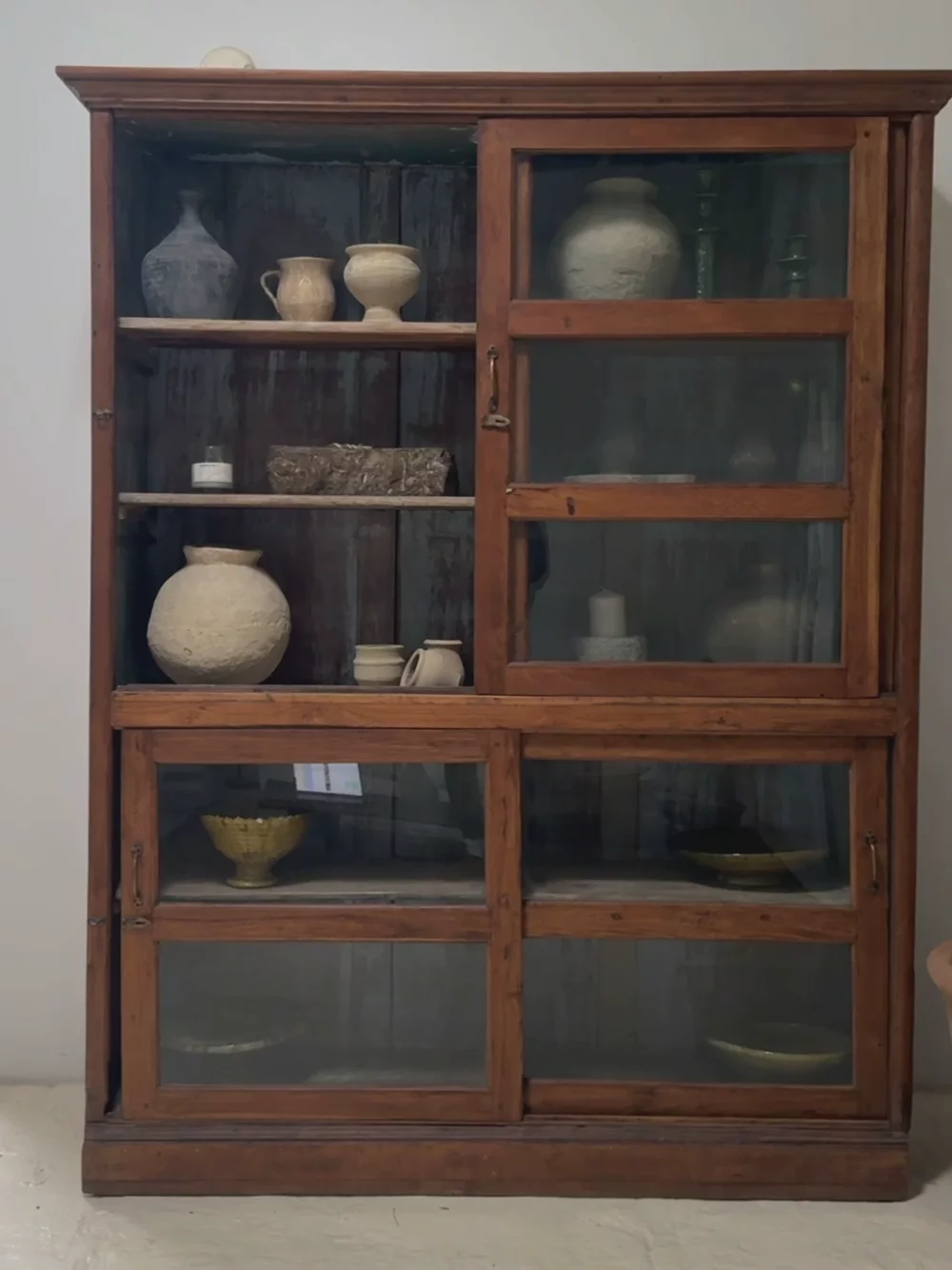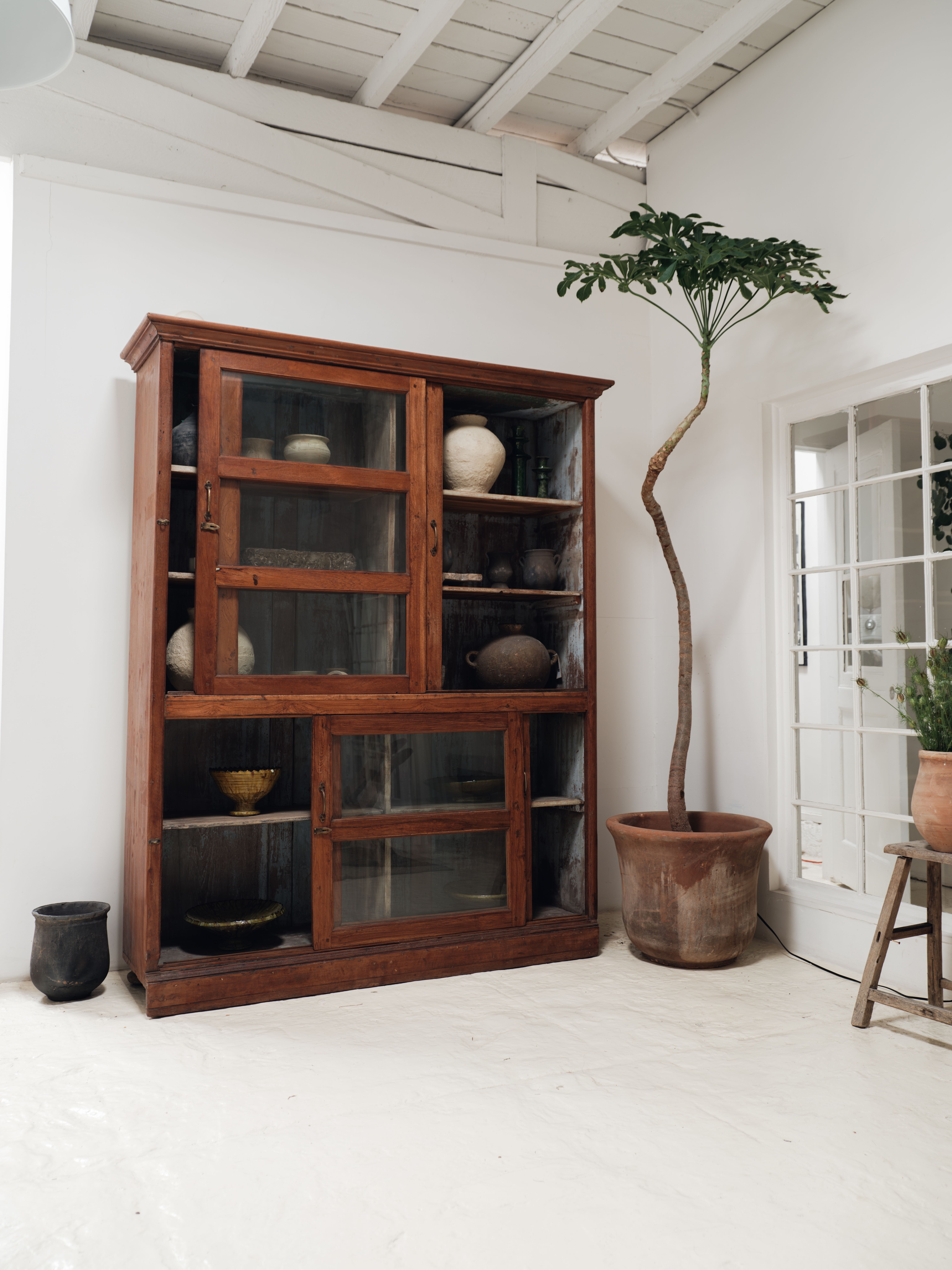 This Indian wood and glass panel cabinet exudes understated elegance with its minimalist design and clean lines. The glass-fronted panels invite a subtle play of light while offering a peek at what lies within—whether it’s stacks of linen or your favorite ceramics. Perched on rounded ball feet, this piece carries just enough personality to stand out without shouting for attention. A simple yet refined addition, exactly as pictured.