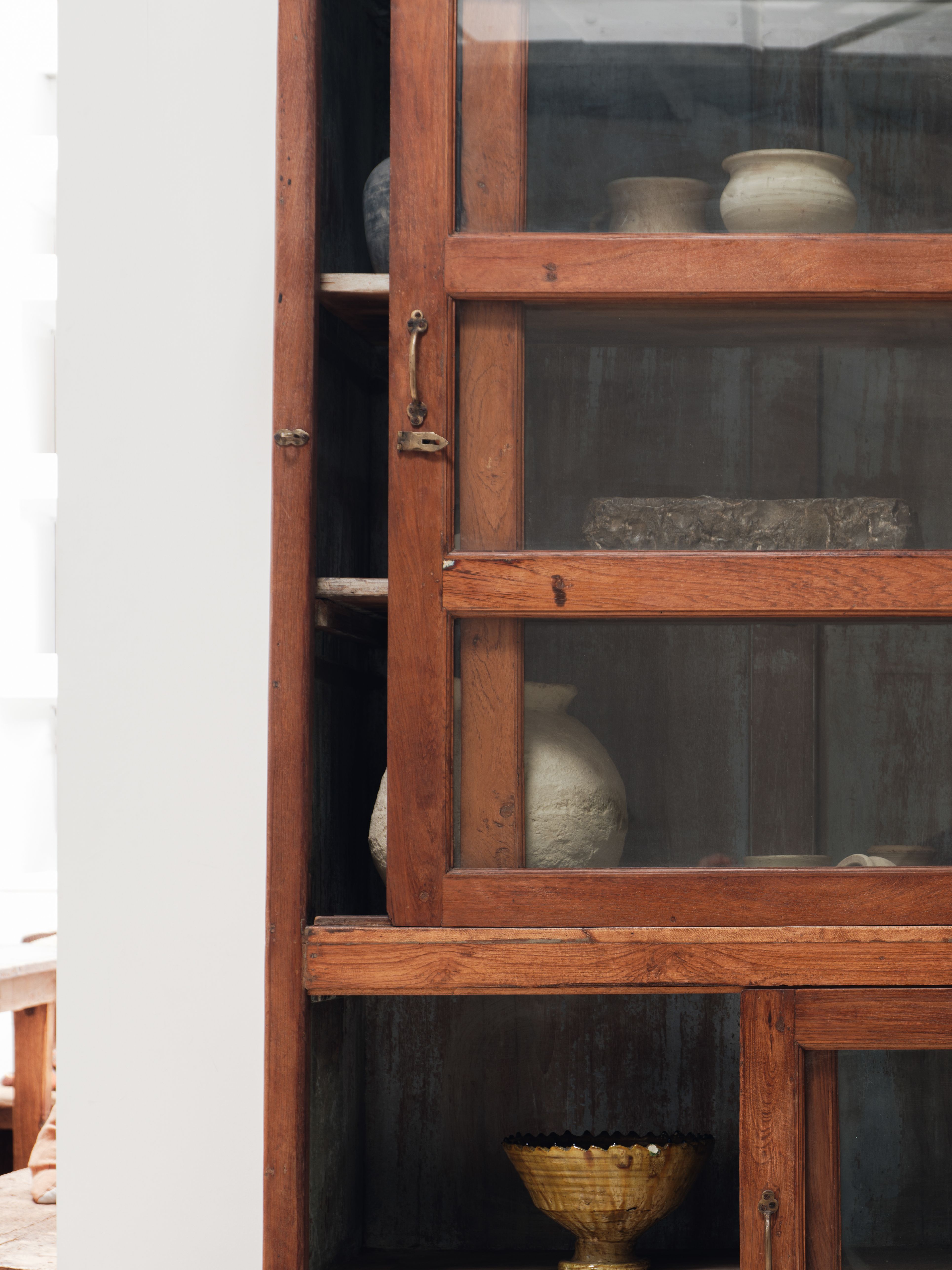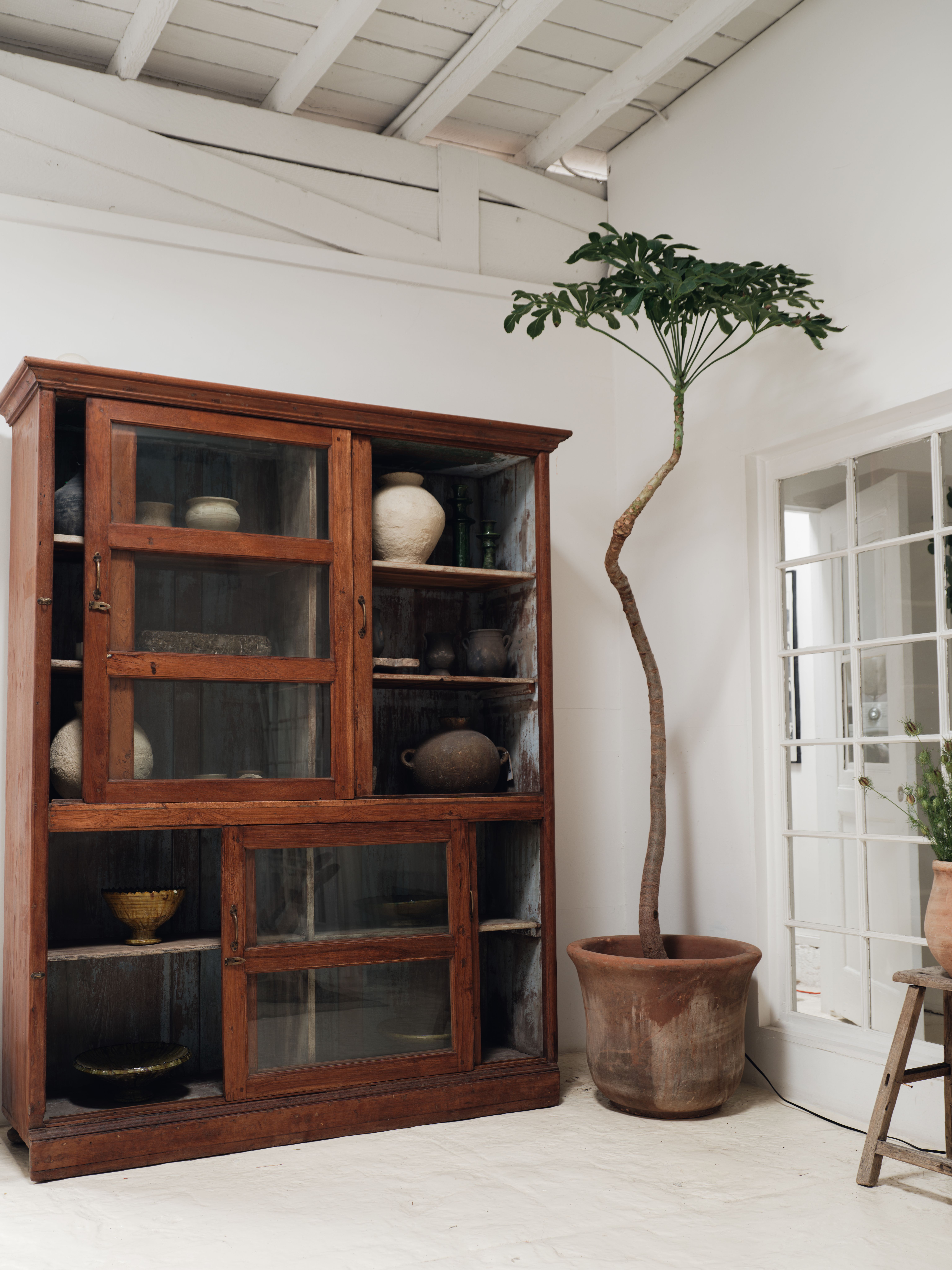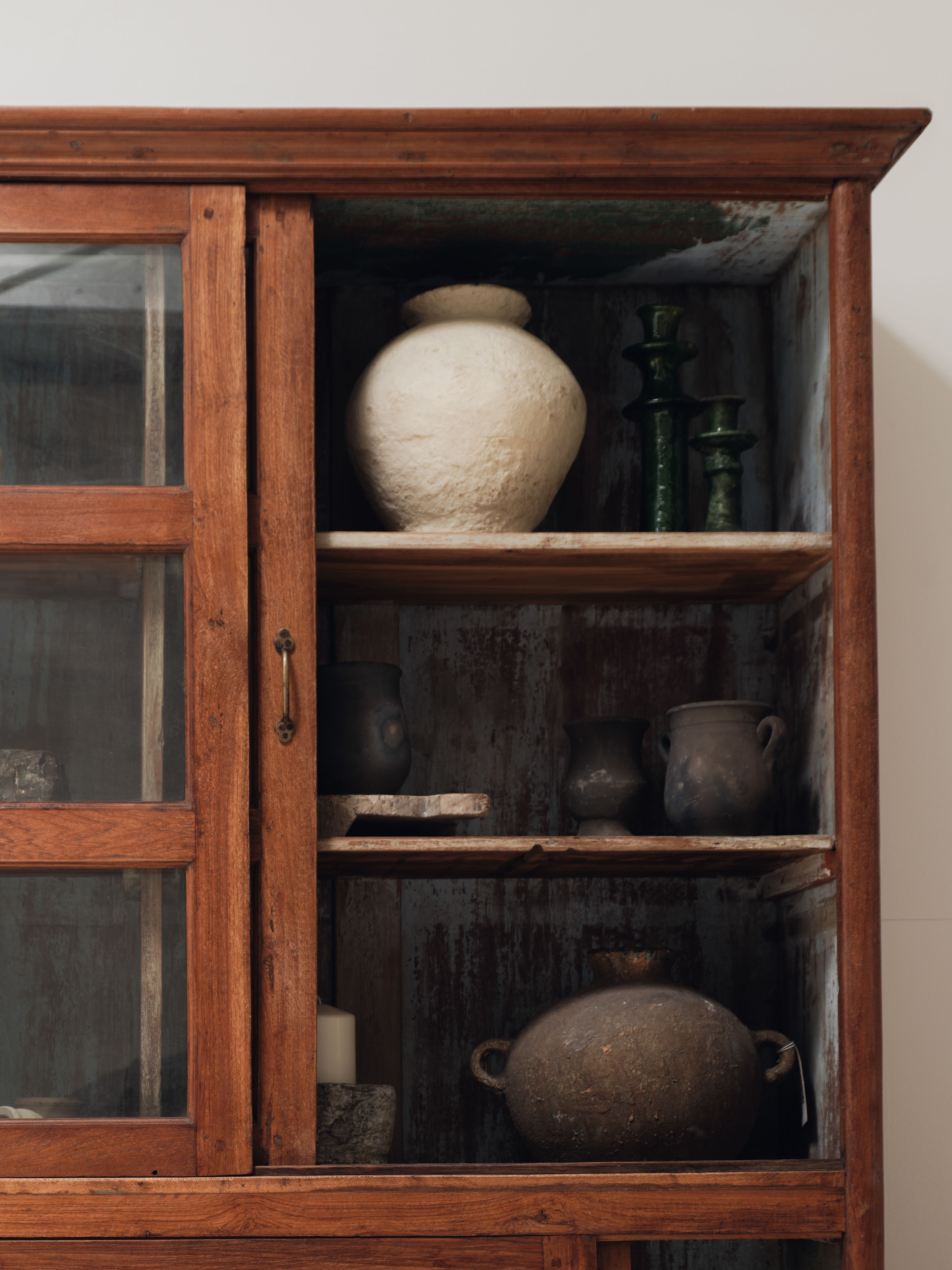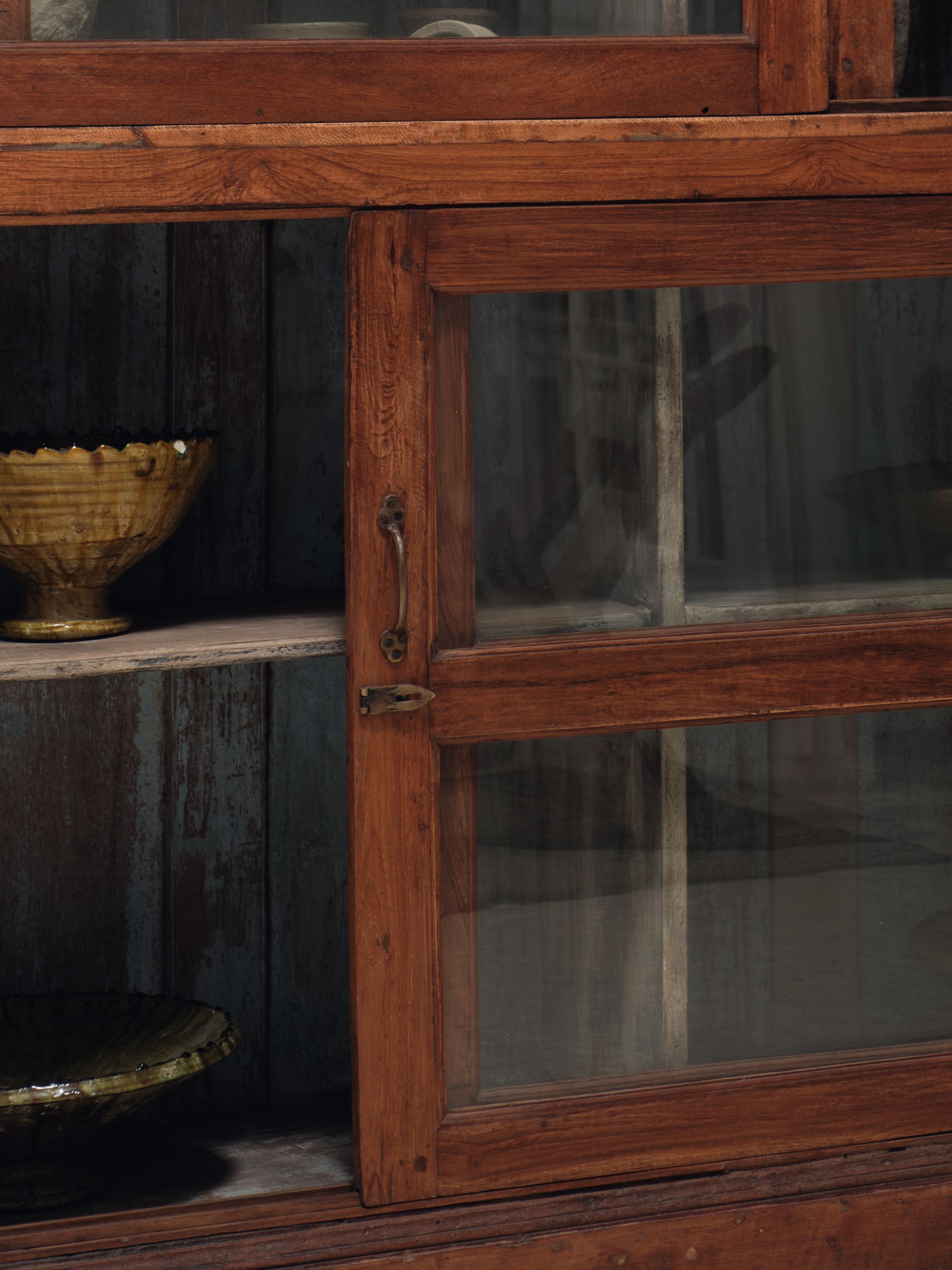 This Indian wood and glass panel cabinet exudes understated elegance with its minimalist design and clean lines. The glass-fronted panels invite a subtle play of light while offering a peek at what lies within—whether it’s stacks of linen or your favorite ceramics. Perched on rounded ball feet, this piece carries just enough personality to stand out without shouting for attention. A simple yet refined addition, exactly as pictured.