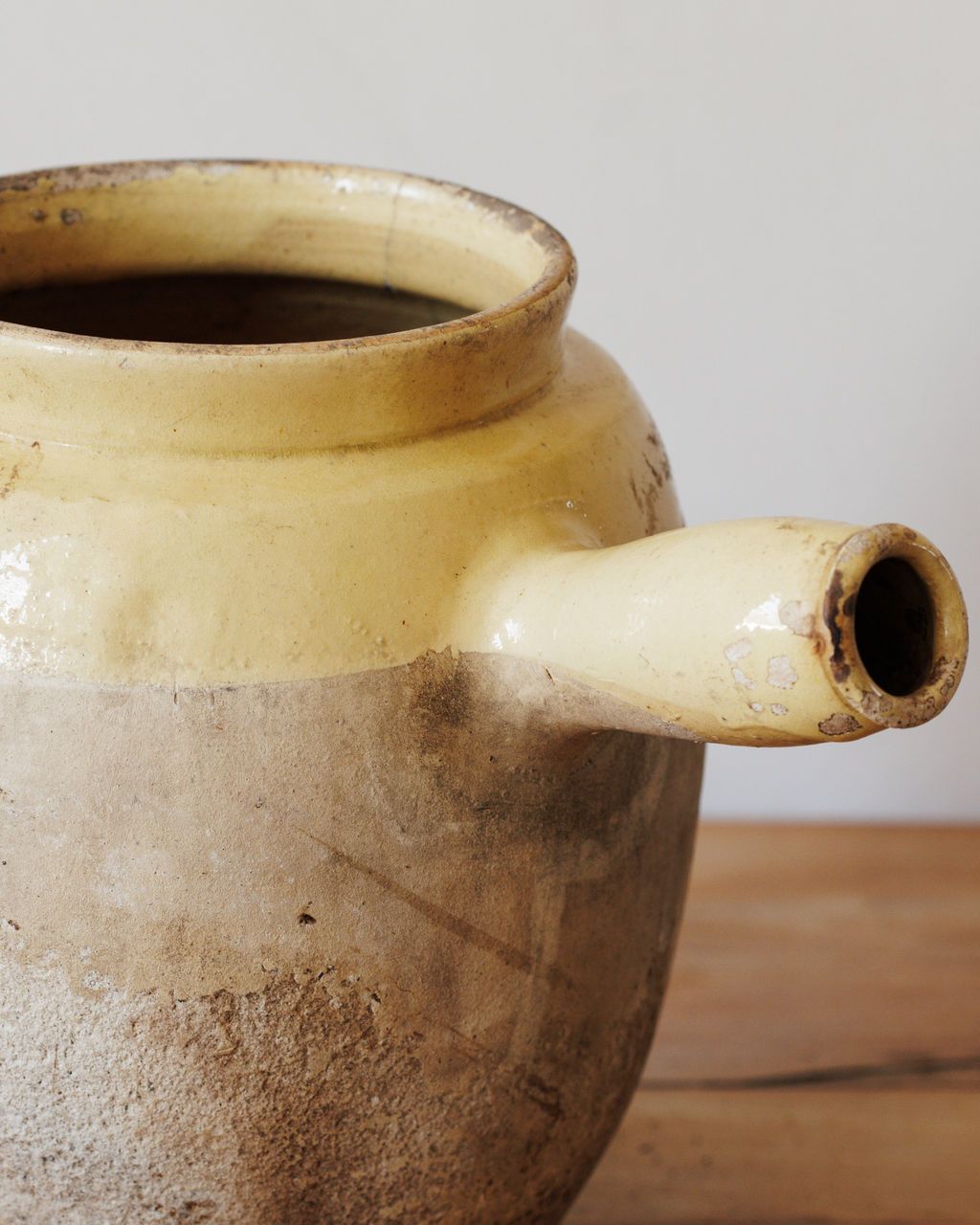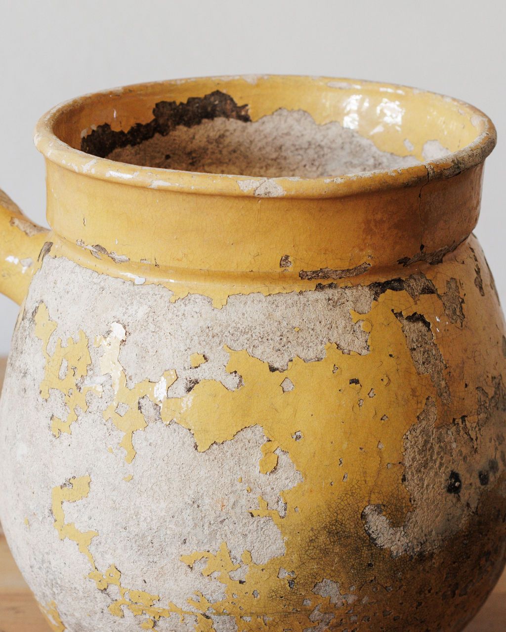 Collectors alert! These exquisite Toupin cooking pots, in both large and small sizes, come with yellow and cream glazes that show their age perfectly with marks and chips. With a sturdy handle, they're perfect for holding your cooking utensils on your kitchen counter or showing off some fresh herbs.