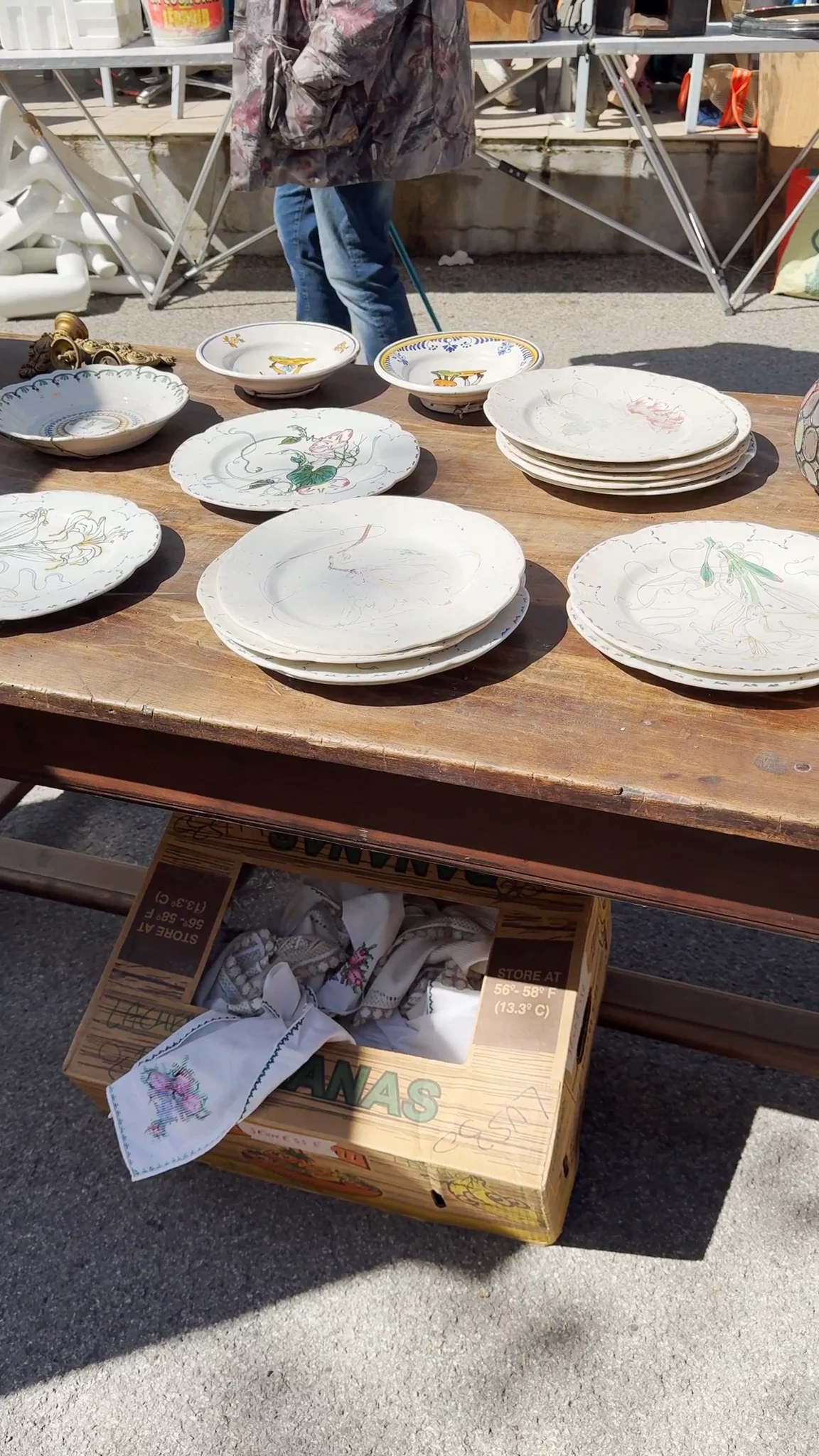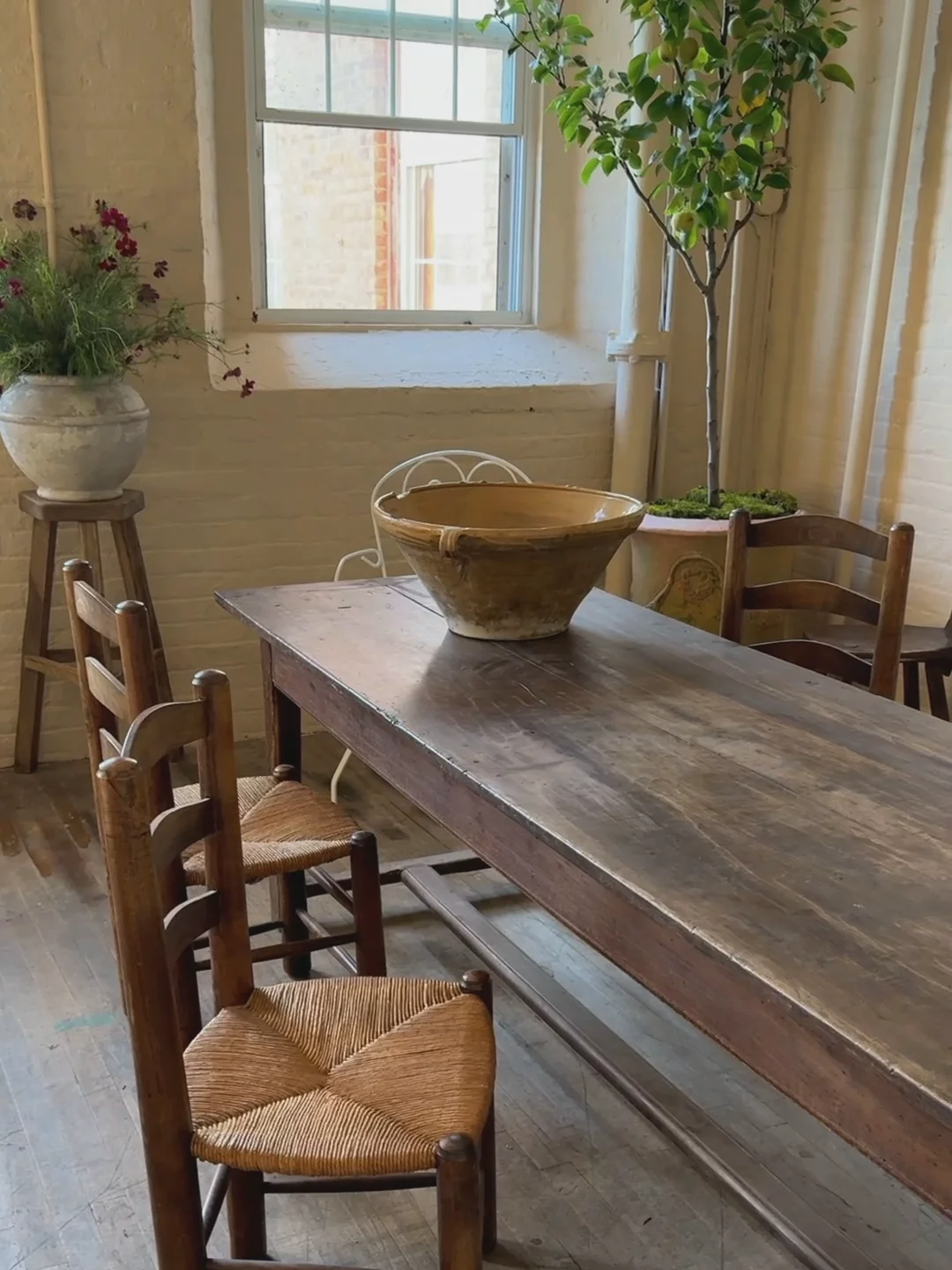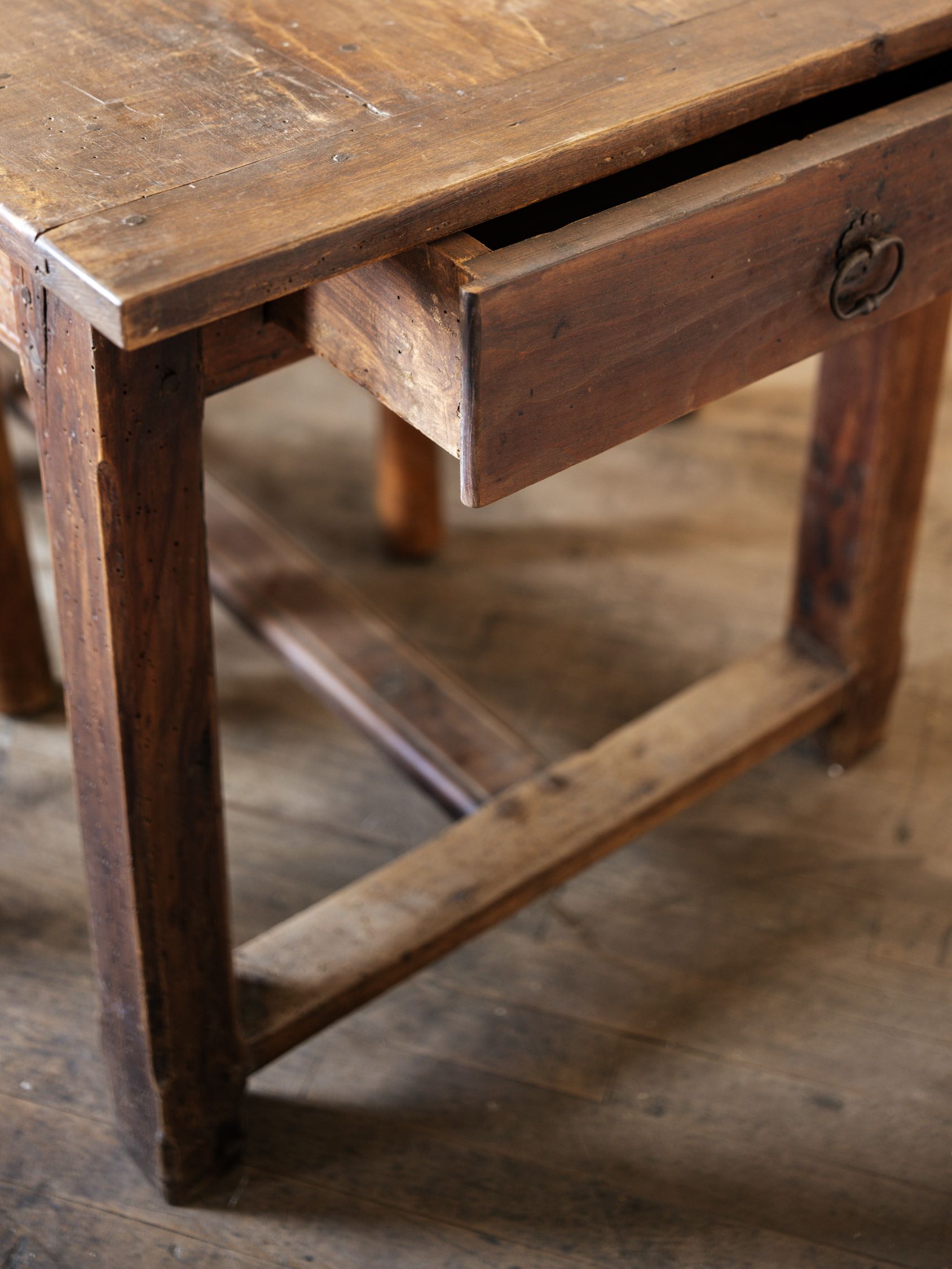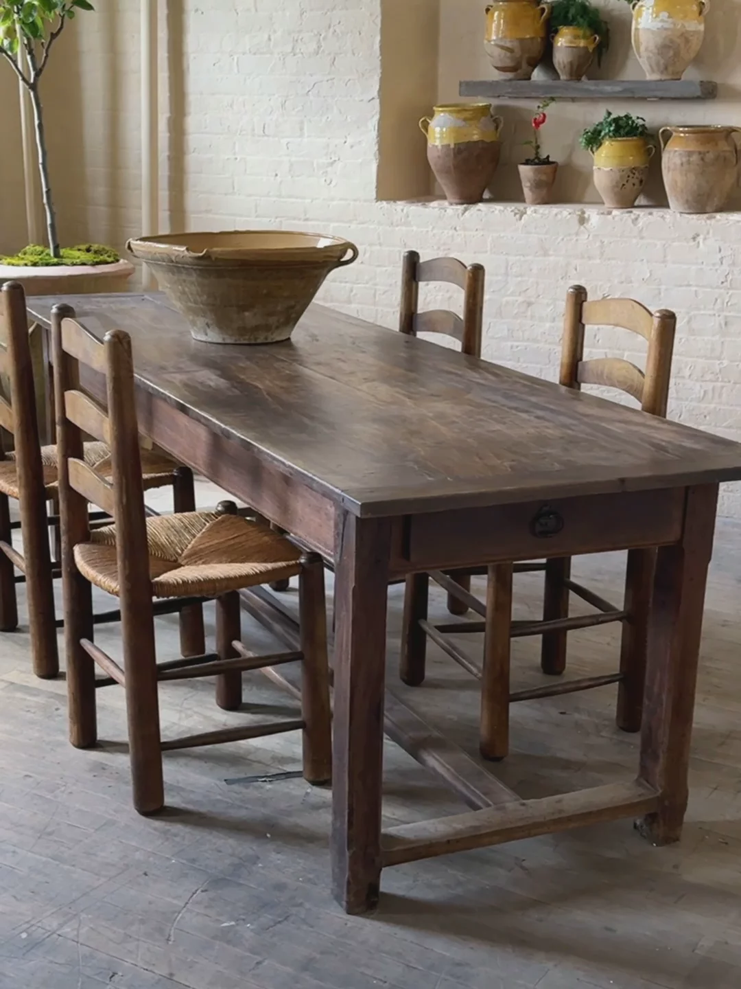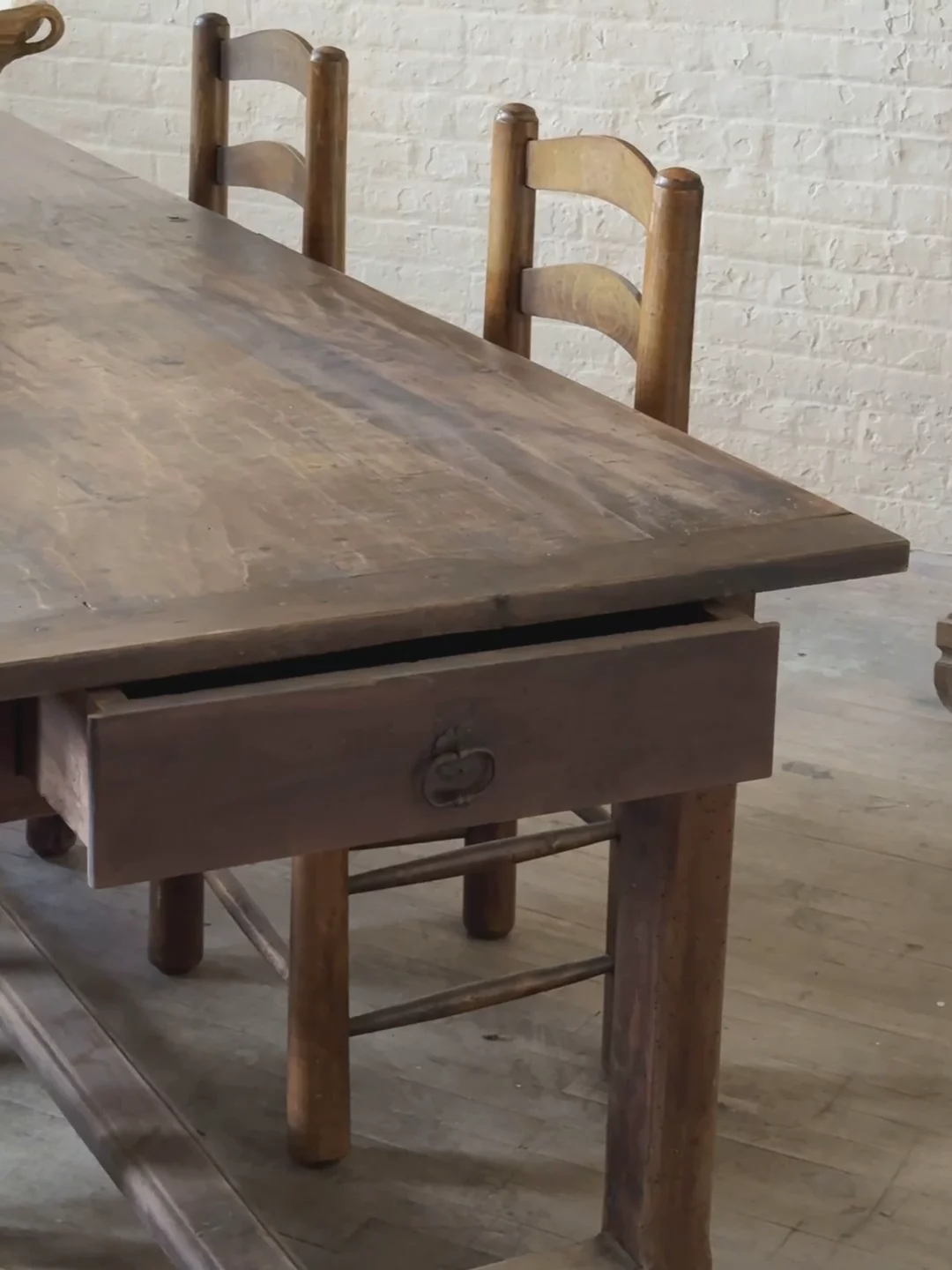This large walnut farm table, with a built-in drawer, boasts a dark, rich patina and a surface worn smooth by years of use. Perfect for your dining room or styled outdoors with a linen cloth and fresh flowers, this table brings warmth and history to any gathering.