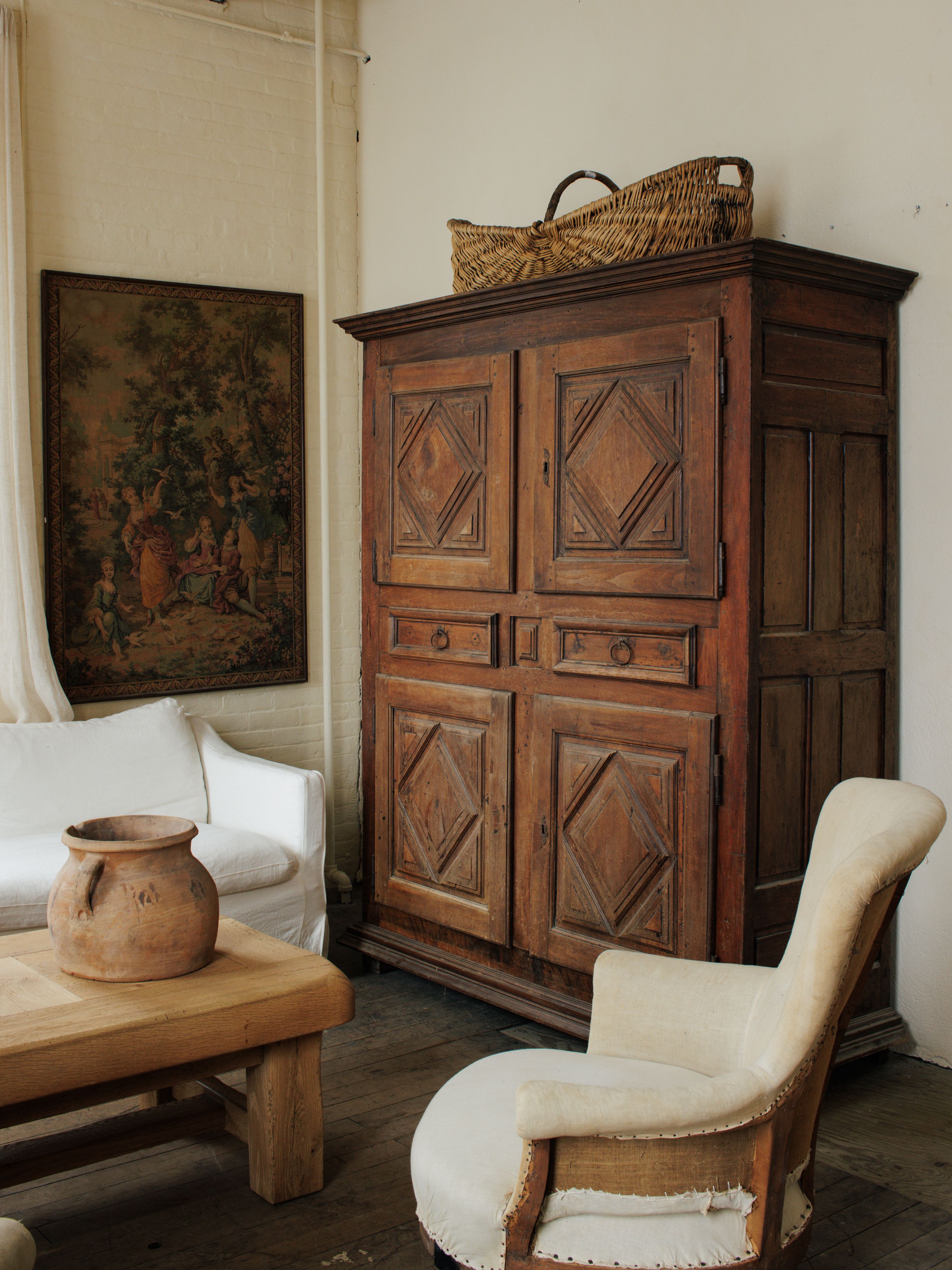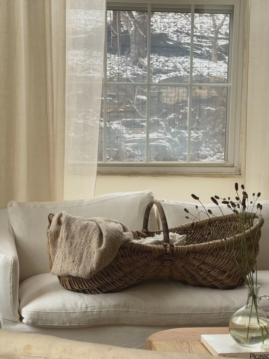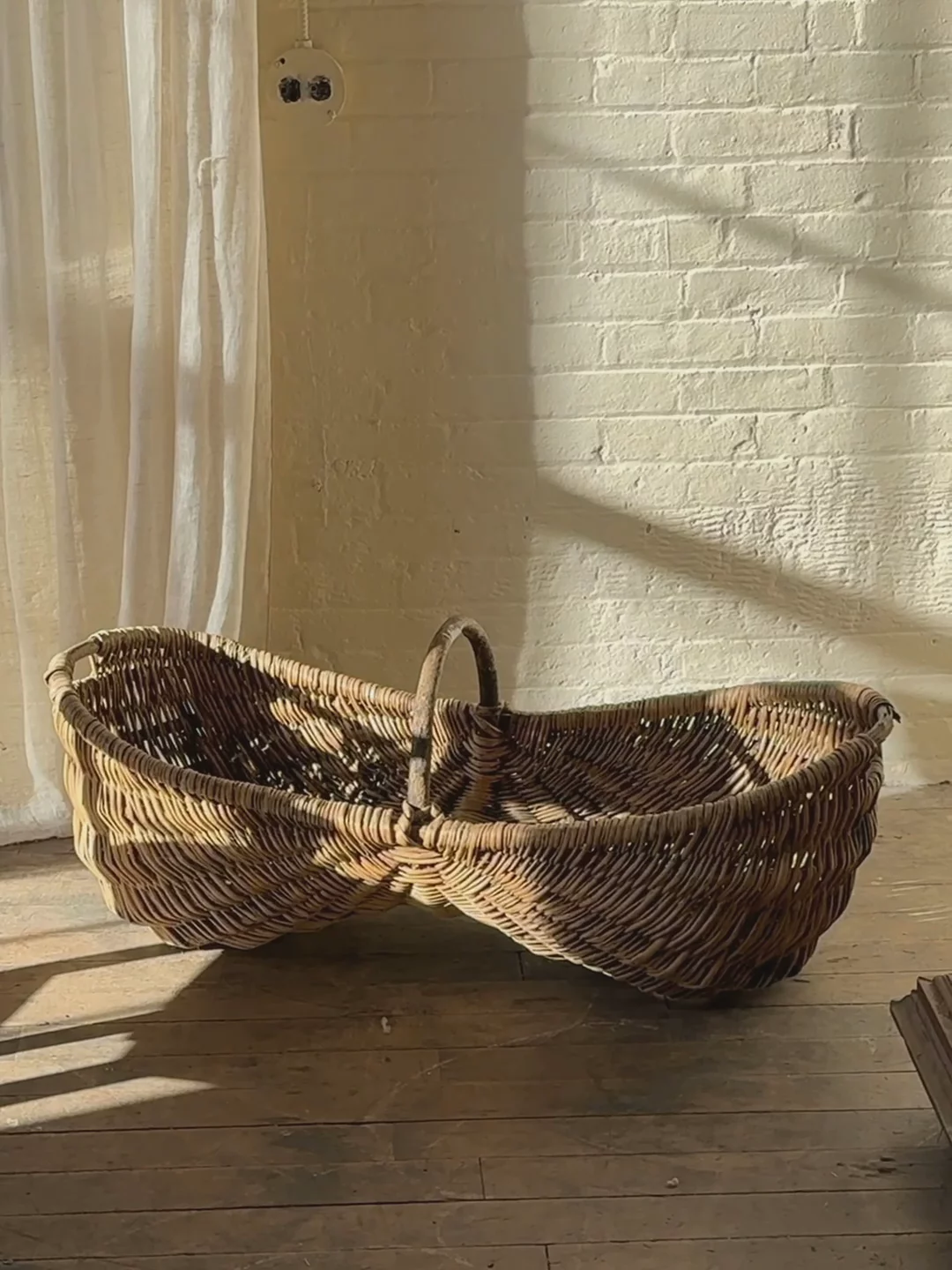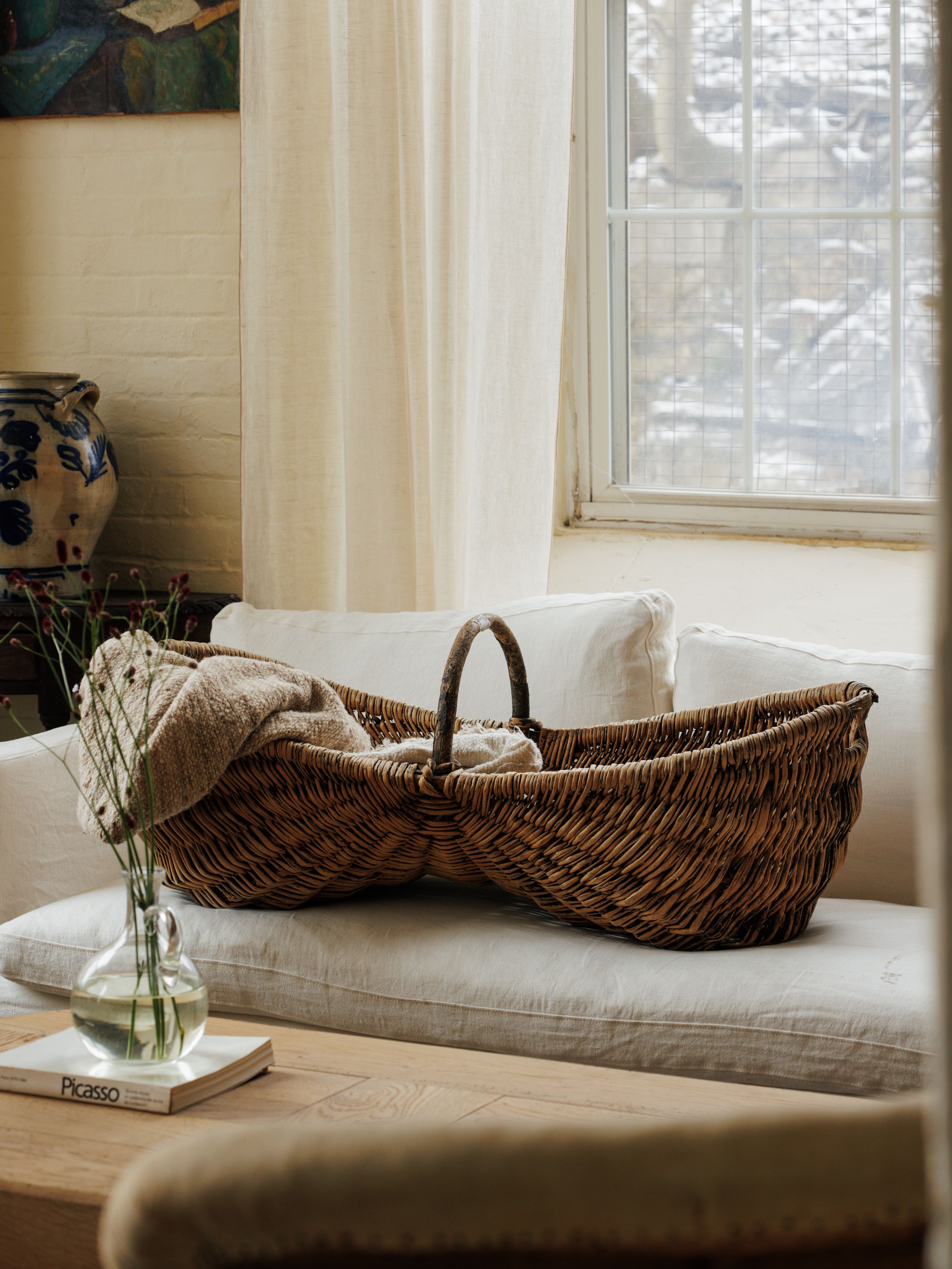 This 1920s grape harvesting basket from Normandy is the real deal. Handwoven with wicker over a wooden frame and topped with a curved bamboo handle, it’s the kind of piece that tells a story. Once used to gather grapes and apples, it’s aged beautifully, with a weathered finish that only gets better with time. Sylvie loves it packed with blankets on a cabinet top or casually leaning in a corner.