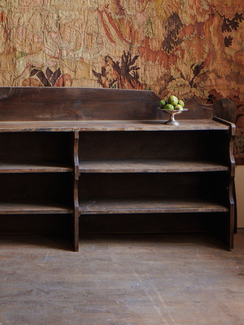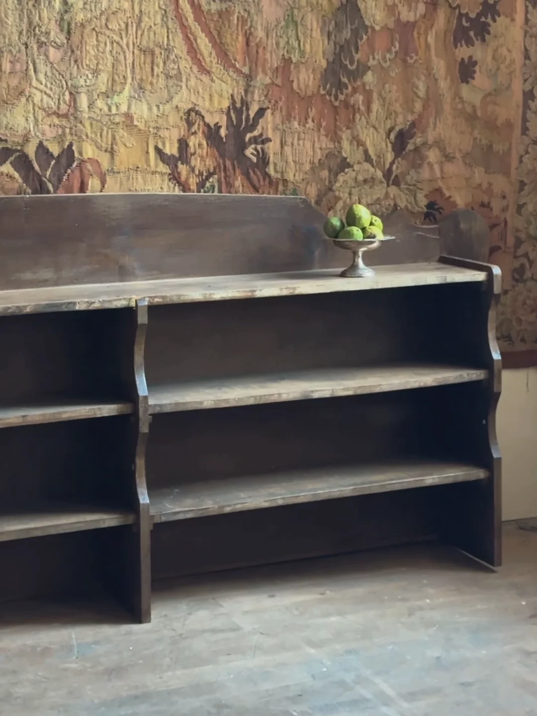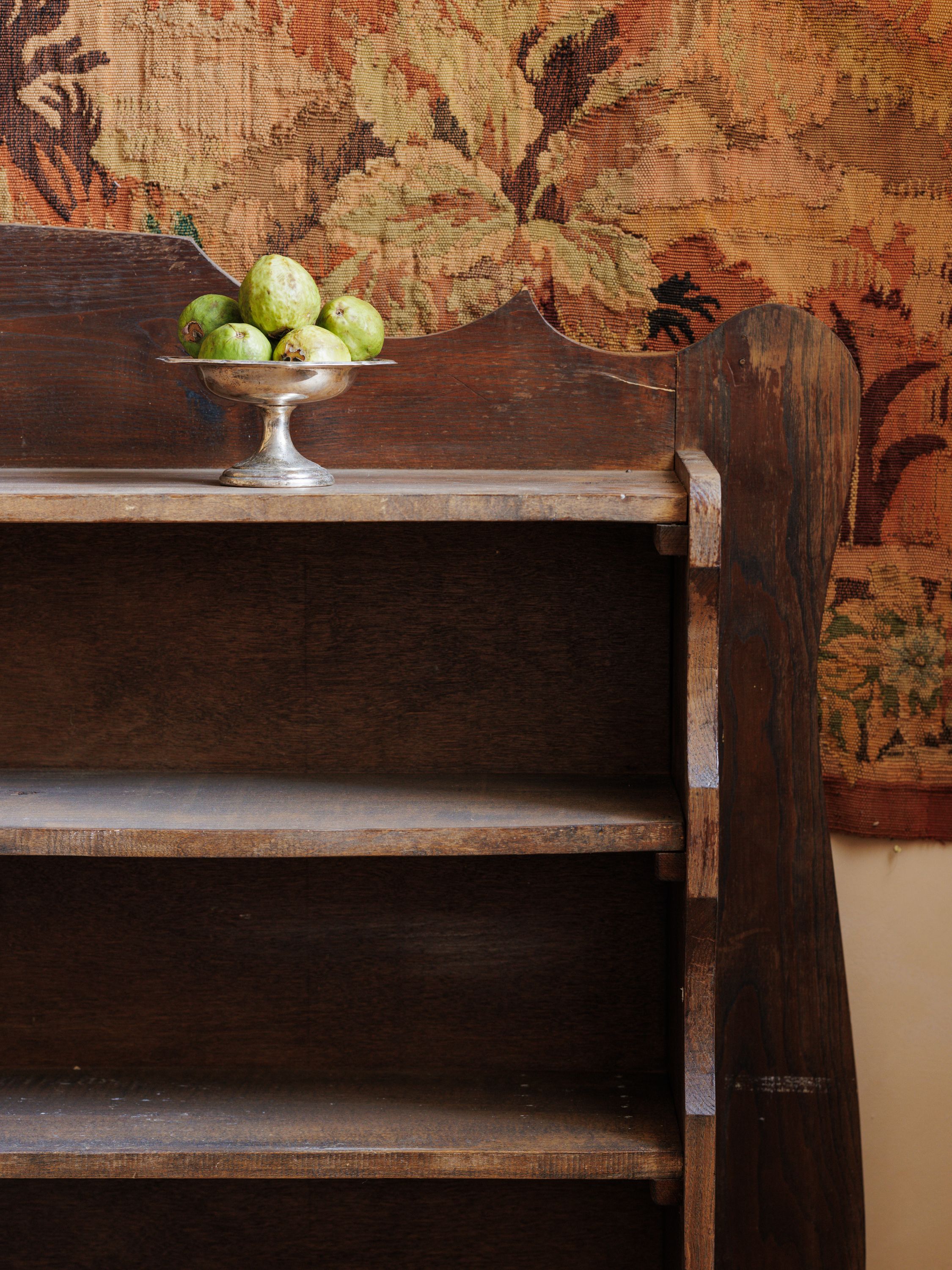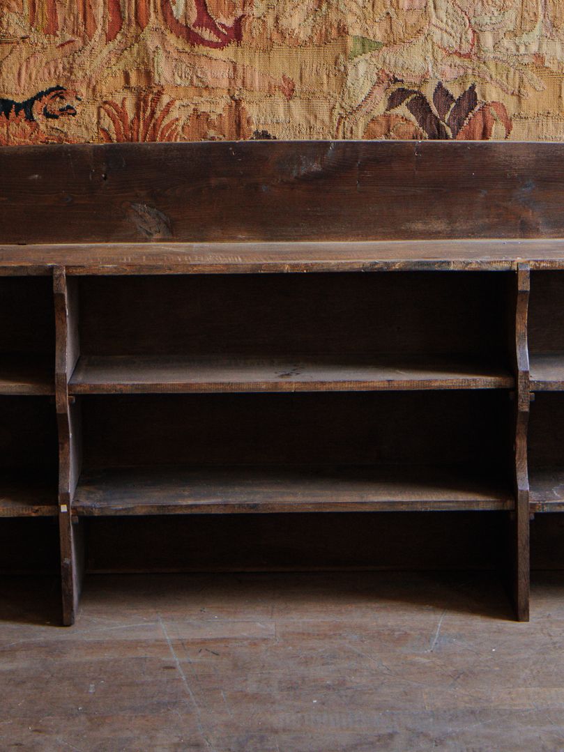 Manifest your inner librarian. An expansive wooden silhouette, this low bookcase offers both form and function with its broad shelves and stunning craftsmanship. Perfect for organizing books, styling your favorite vessels, or arranging personal treasures. We've never seen a bookcase like this, and probably wont ever find another. It looks breathtaking when placed under a piece of art or tapestry.