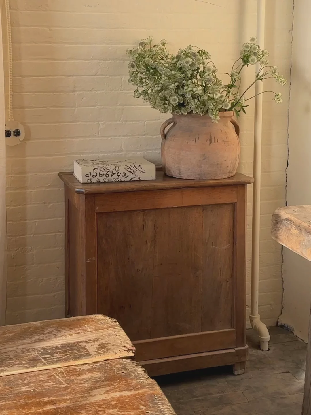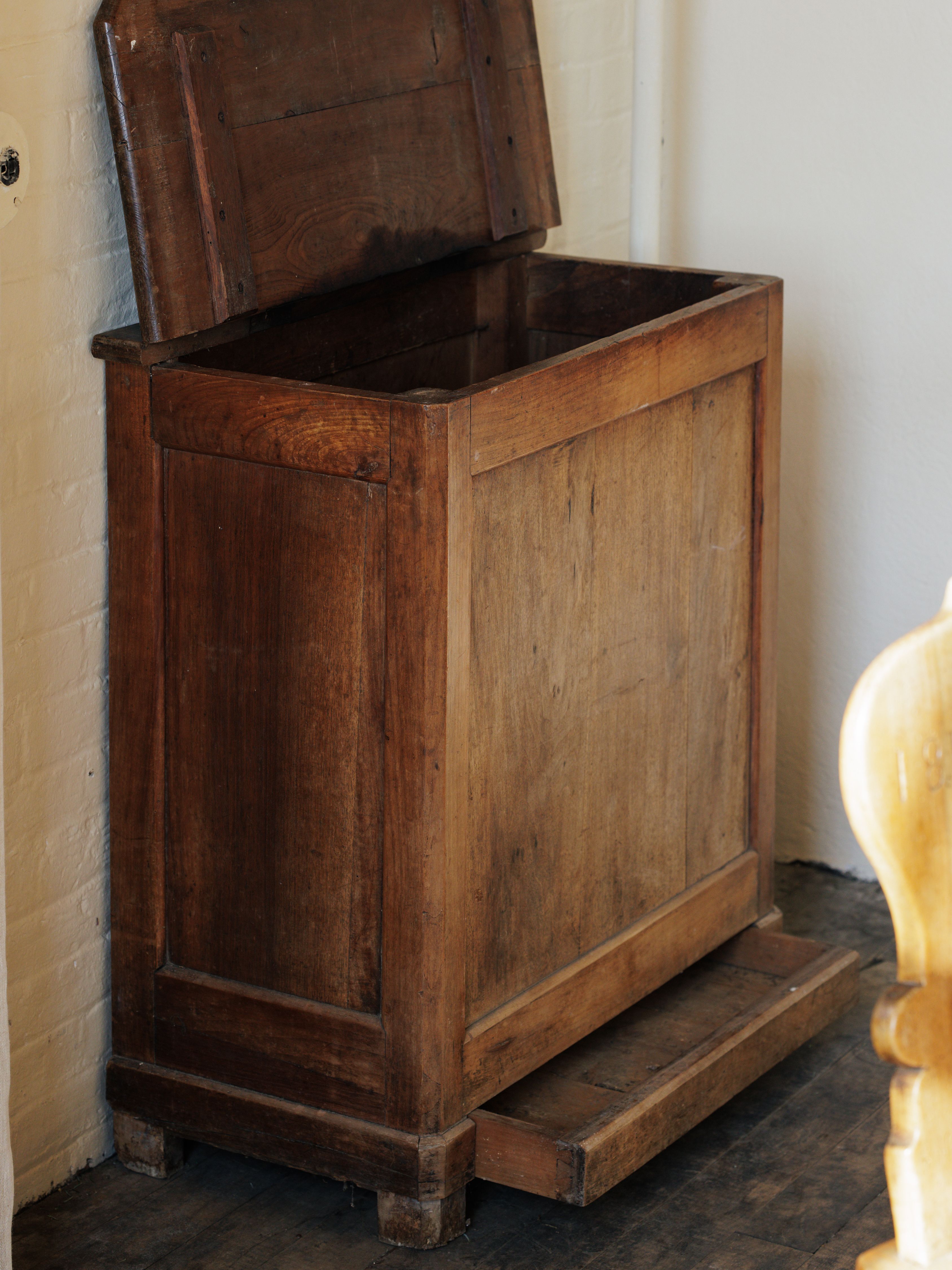 This 19th-century cabinet, once a baker’s grain box, is the kind of rare find that makes you do a double take. The hinged lid opens to reveal a spacious interior, originally used for storing grain, while the sliding tray at the bottom was crafted for clearing crumbs from freshly baked loaves. Sylvie loves it as a storage piece in a kitchen, a charming bar cabinet, or even an unexpected side table.