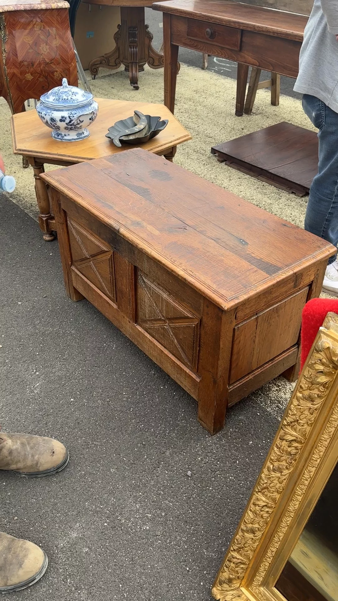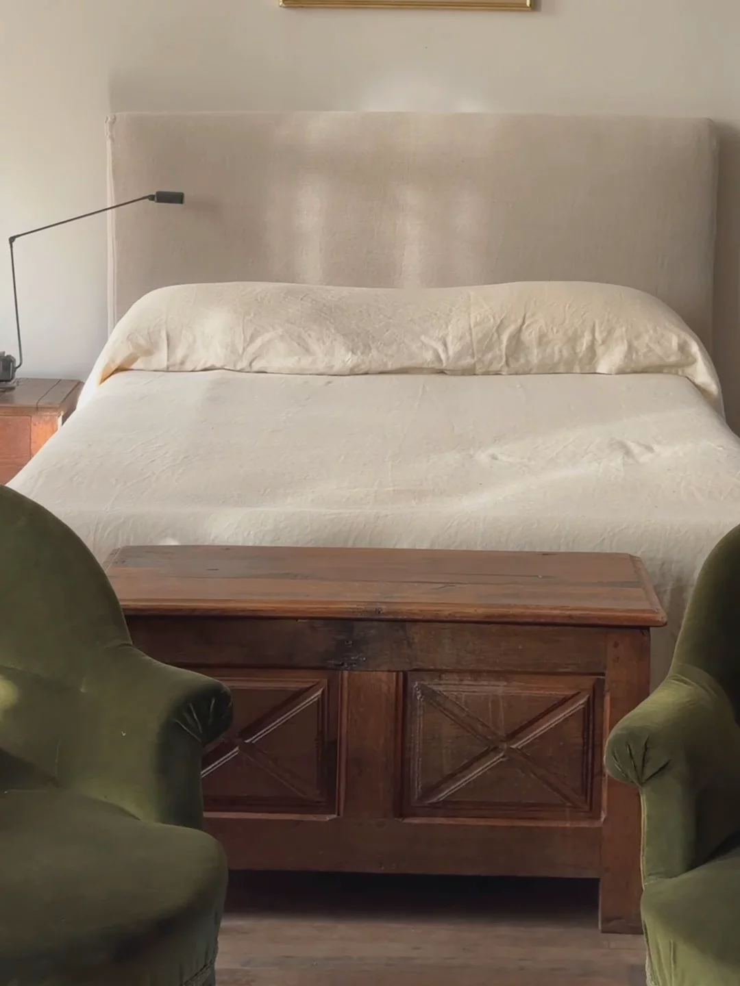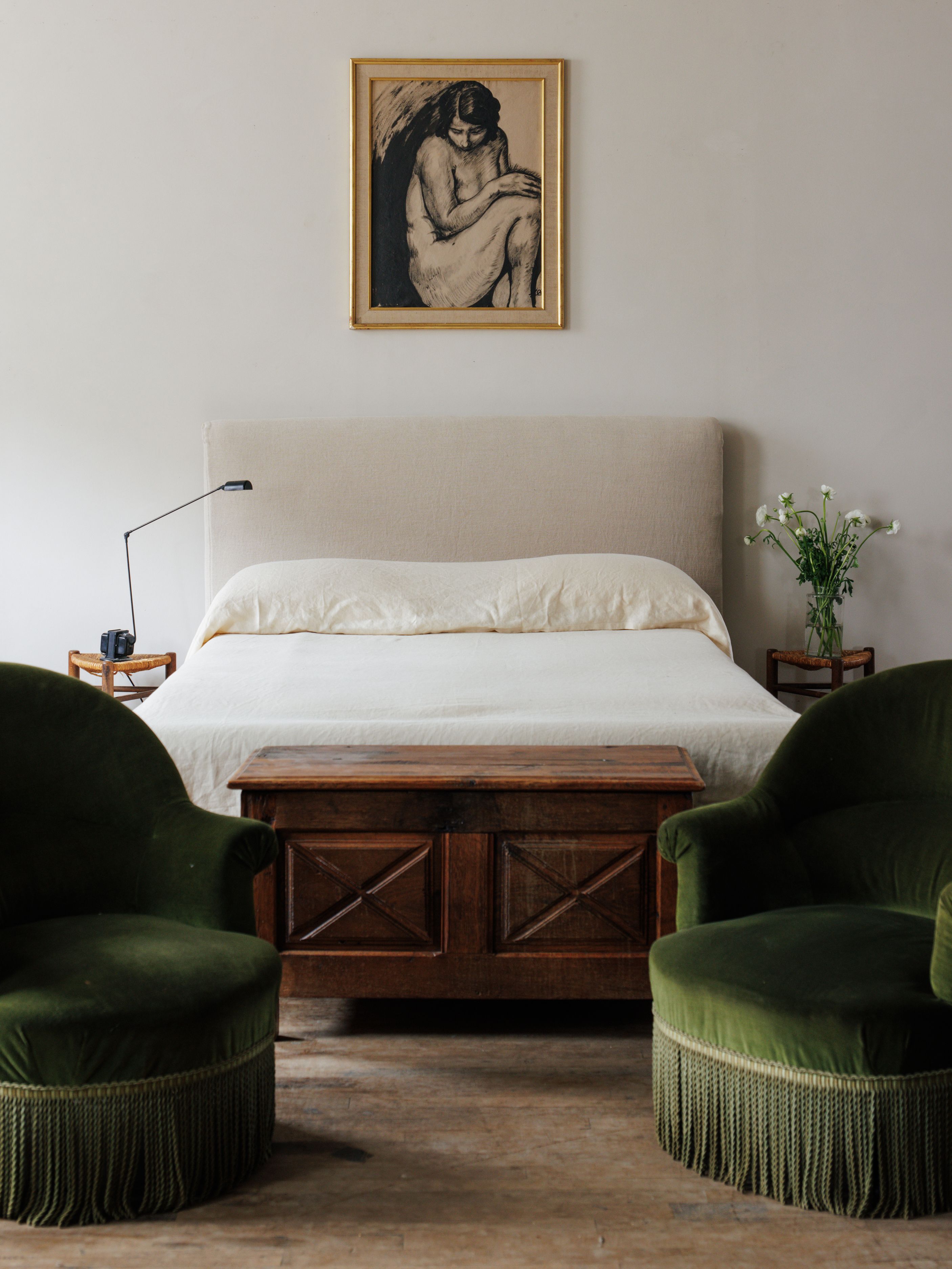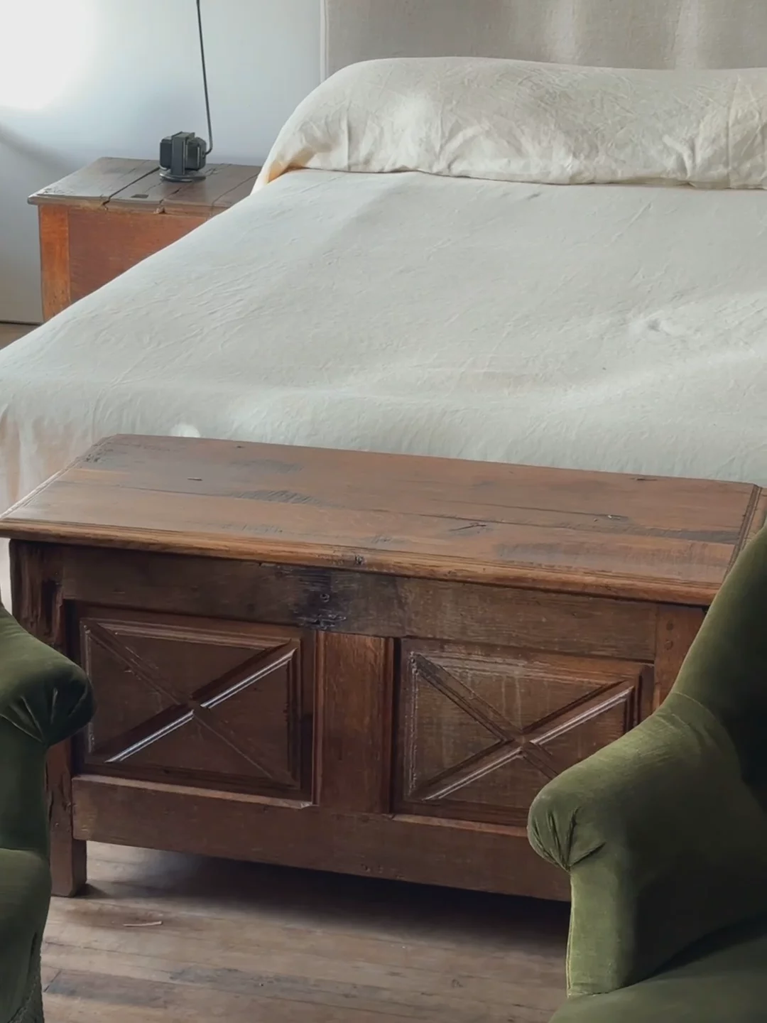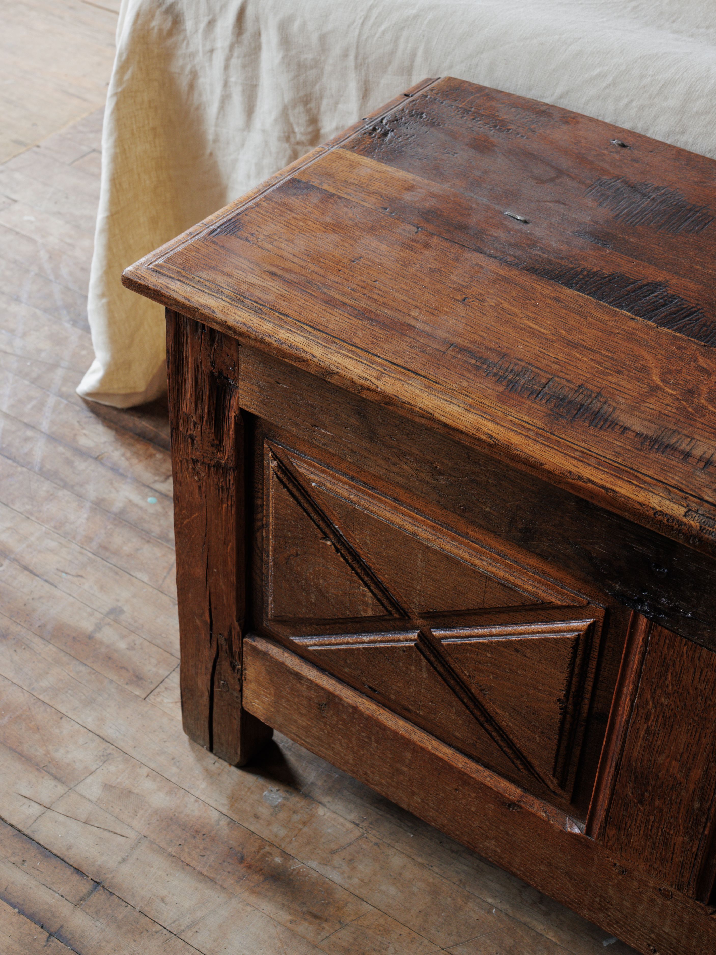 This 19th-century oak trunk is a piece of French history, discovered at a brocante in Avignon. Its Louis XIII style, with signature geometric paneling and sturdy craftsmanship, was designed to endure the journeys of noble travelers. Made from solid oak, it has aged beautifully, with a rich patina that speaks to its storied past. Perfect at the foot of a bed or in an entryway, it’s as functional as it is stunning—ideal for storing blankets, linens, or anything you want to tuck away.