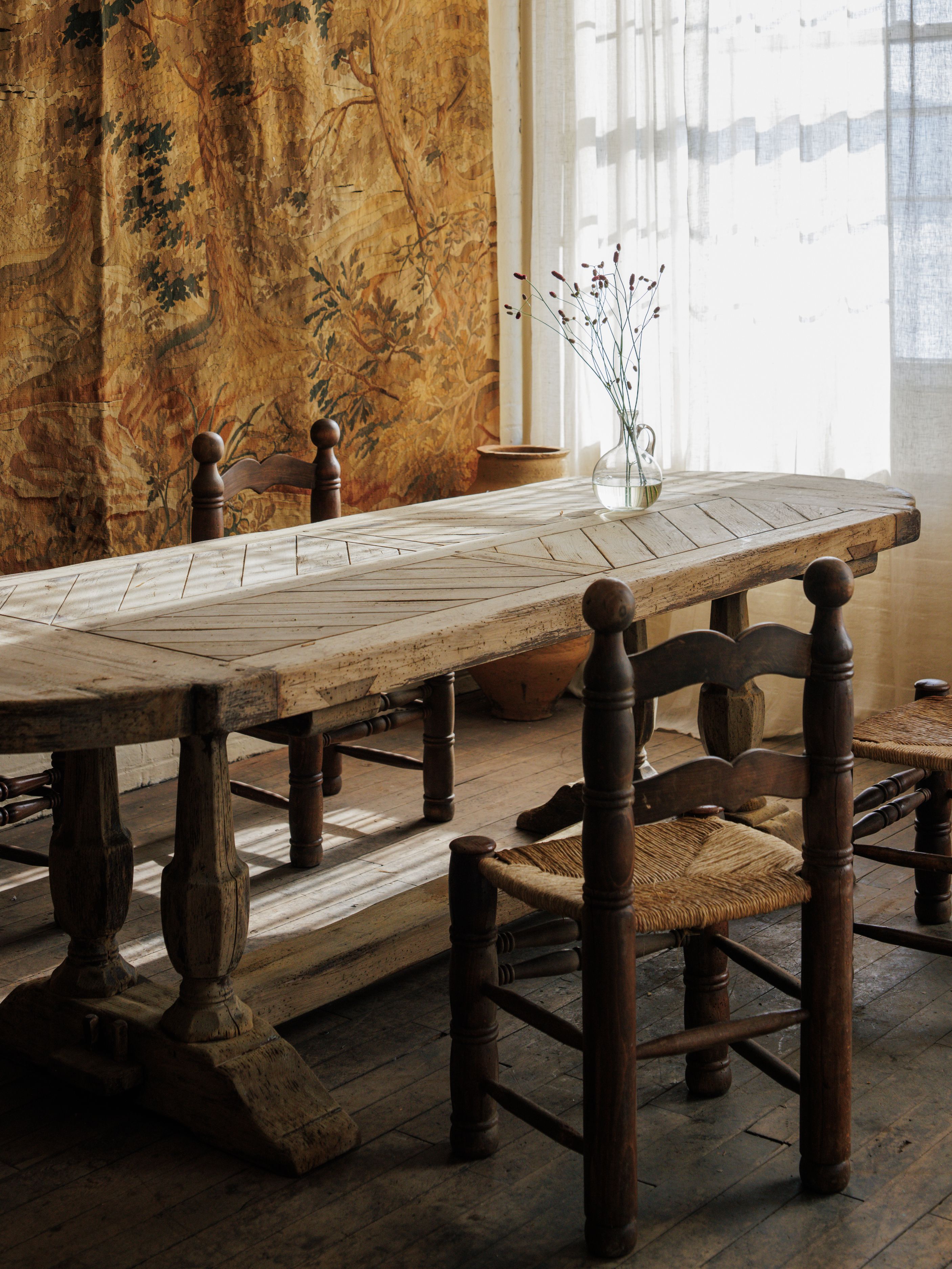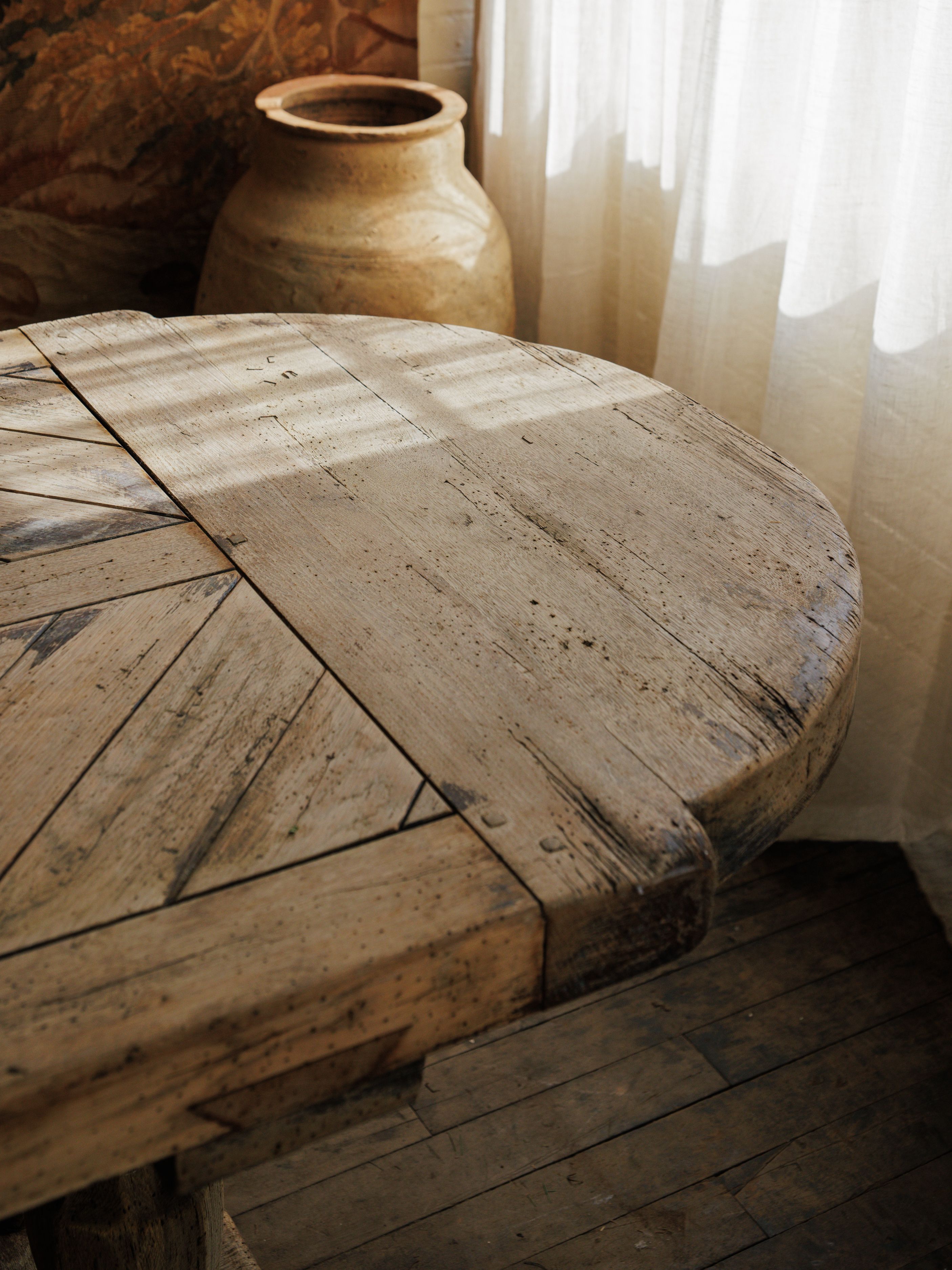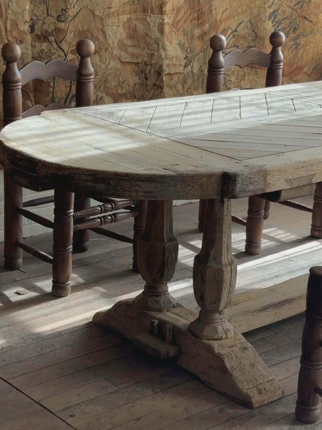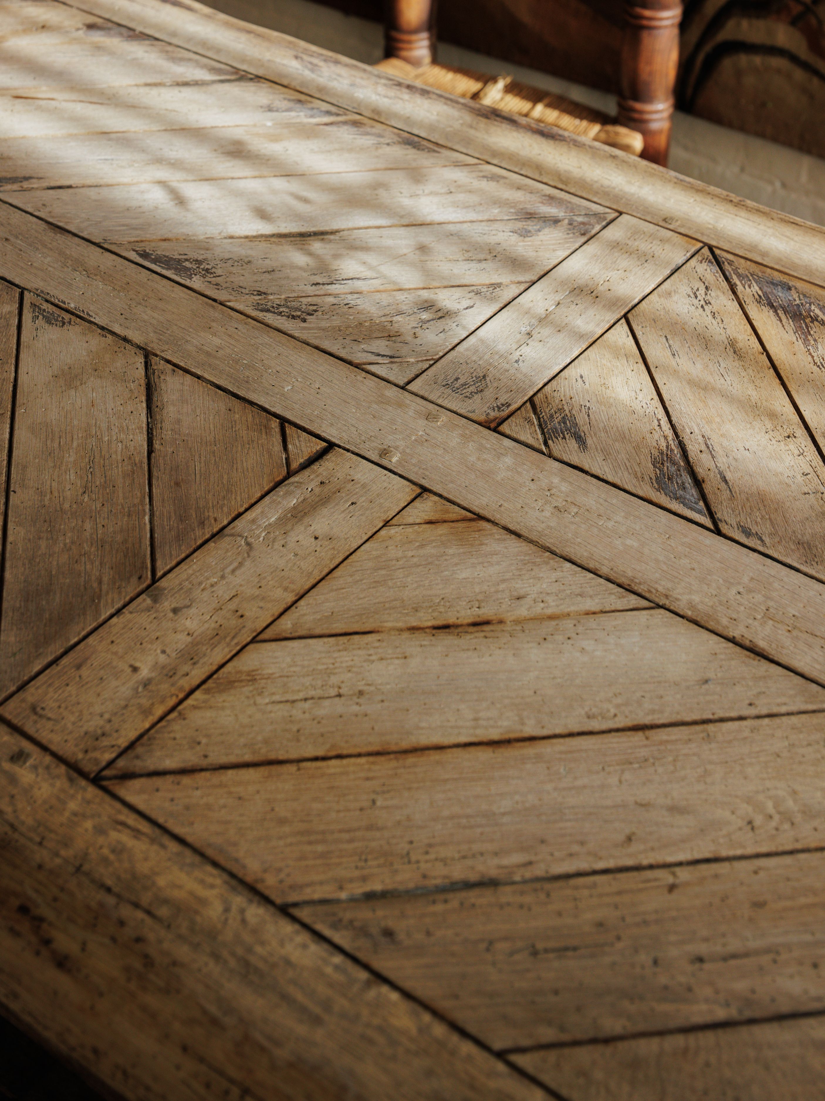 We couldn’t believe our eyes. An oak monastery table with a parquet top, waiting for us in central France. The craftsmanship is undeniable - the thick, hand-hewn slab, the perfectly aged patina, the weight of something built to last. The parquet surface, laid in a herringbone pattern, speaks to the skill of the maker.Monastery tables like this were once found in refectories, where monks gathered for meals and work. Over time, they made their way into châteaux and farmhouses. This one disassembles for easy transport, held together by sturdy bolts, a rare and practical detail.