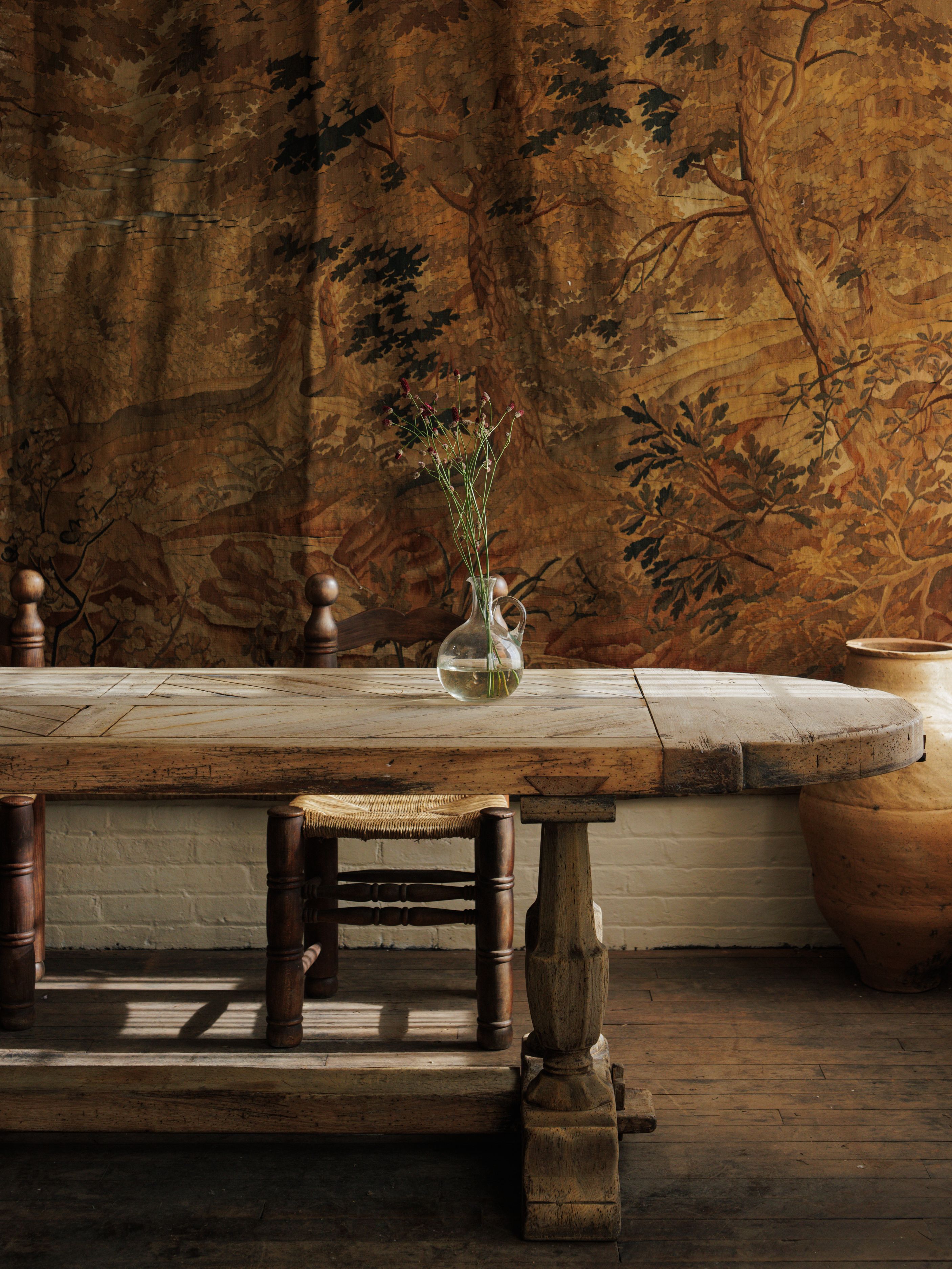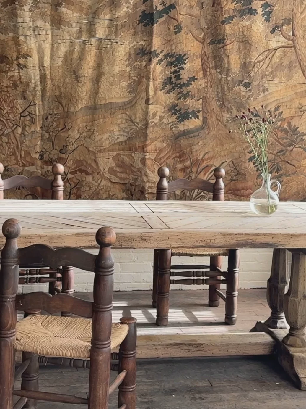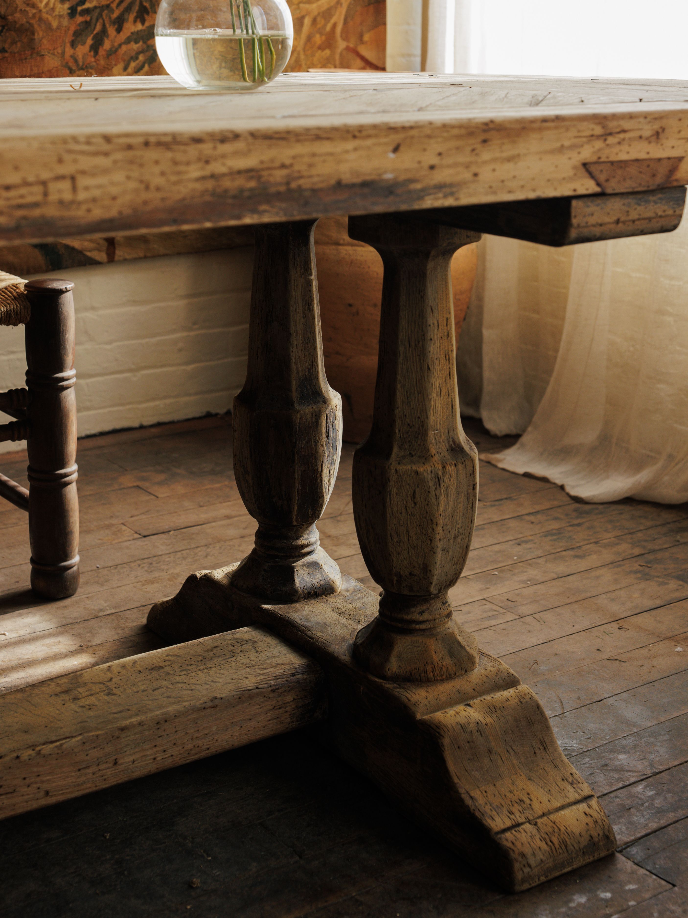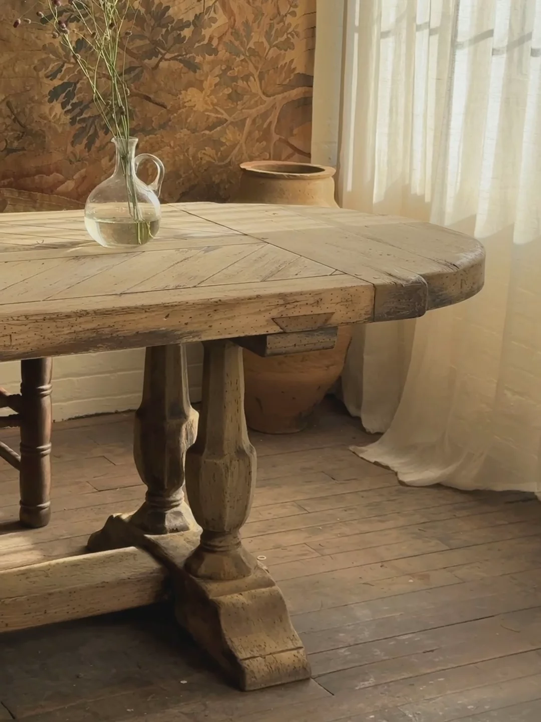 We couldn’t believe our eyes. An oak monastery table with a parquet top, waiting for us in central France. The craftsmanship is undeniable - the thick, hand-hewn slab, the perfectly aged patina, the weight of something built to last. The parquet surface, laid in a herringbone pattern, speaks to the skill of the maker.Monastery tables like this were once found in refectories, where monks gathered for meals and work. Over time, they made their way into châteaux and farmhouses. This one disassembles for easy transport, held together by sturdy bolts, a rare and practical detail.