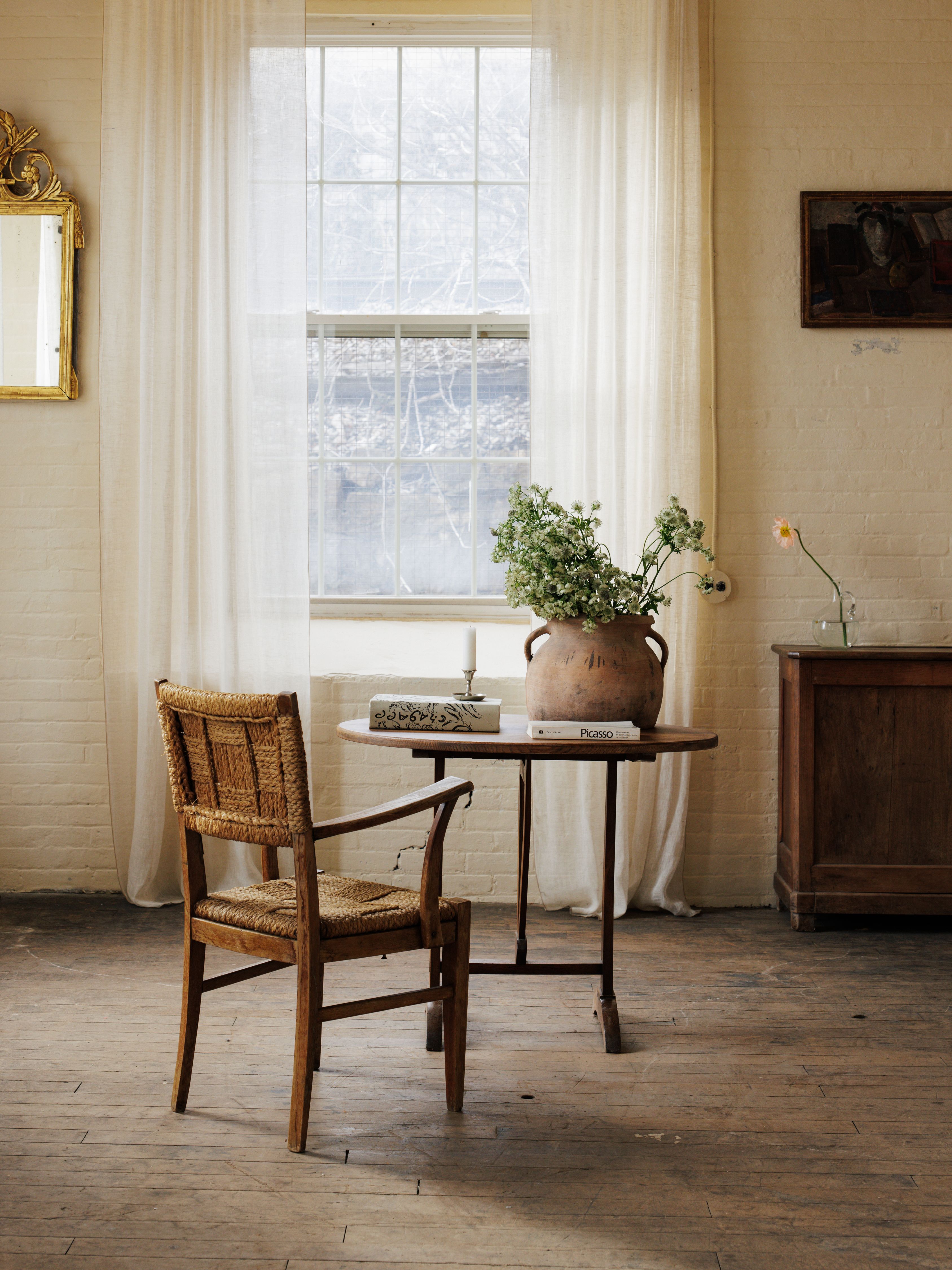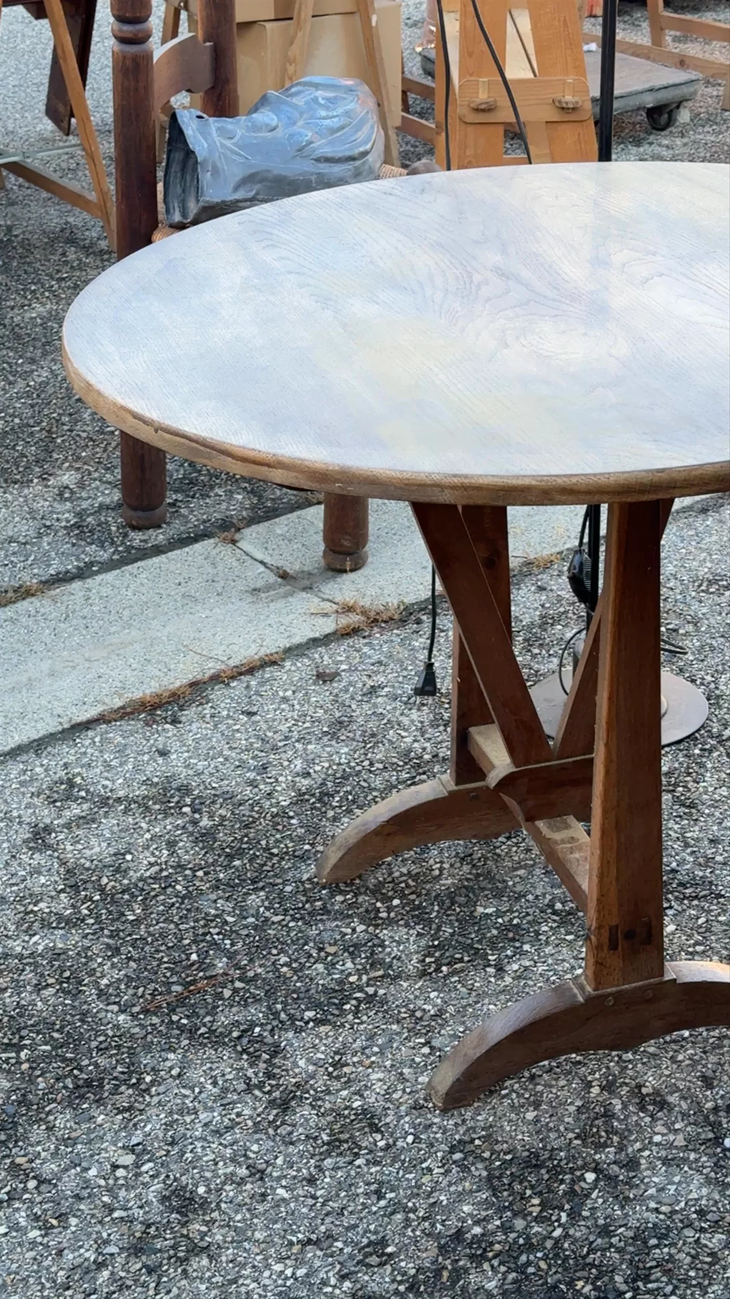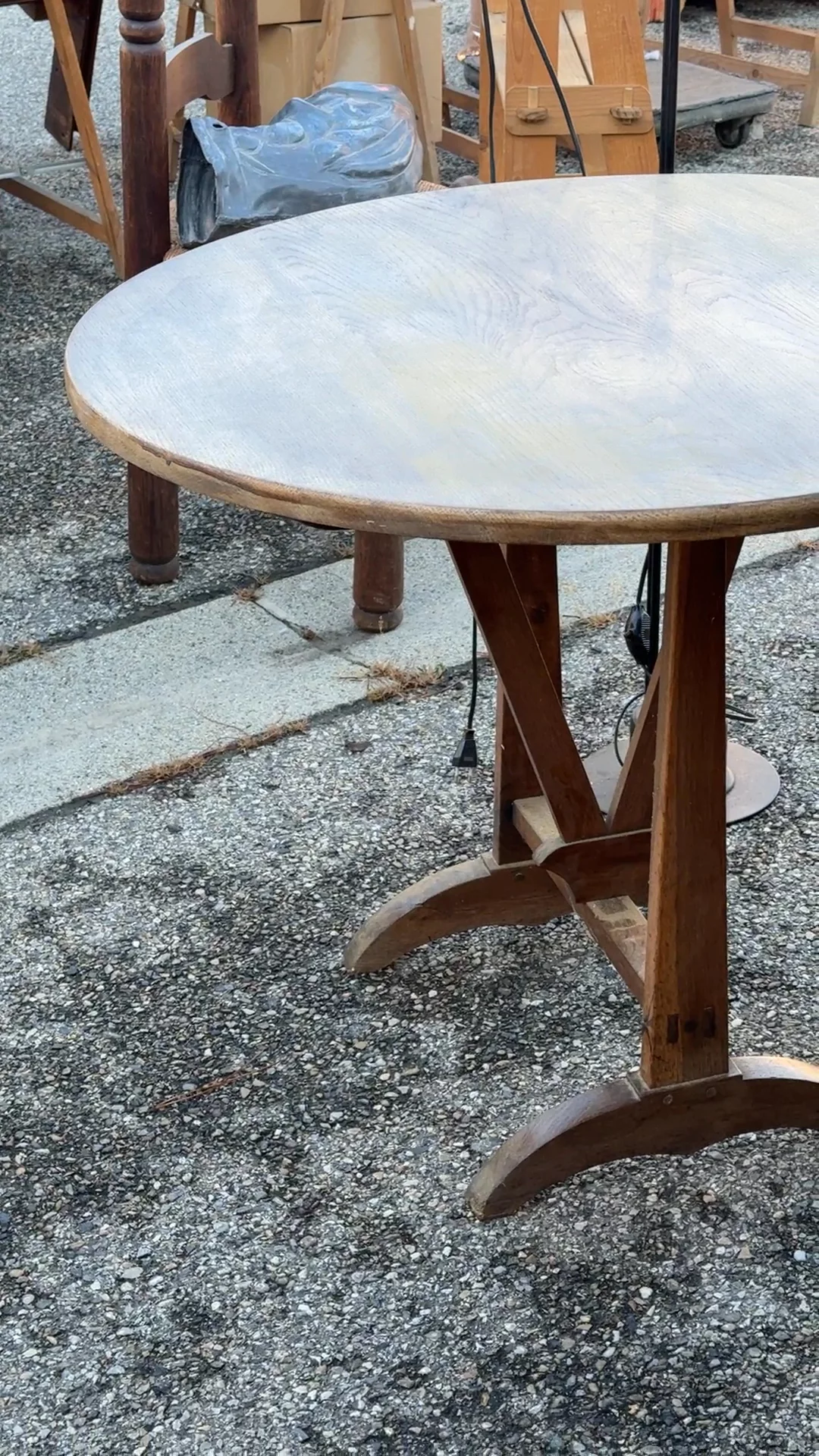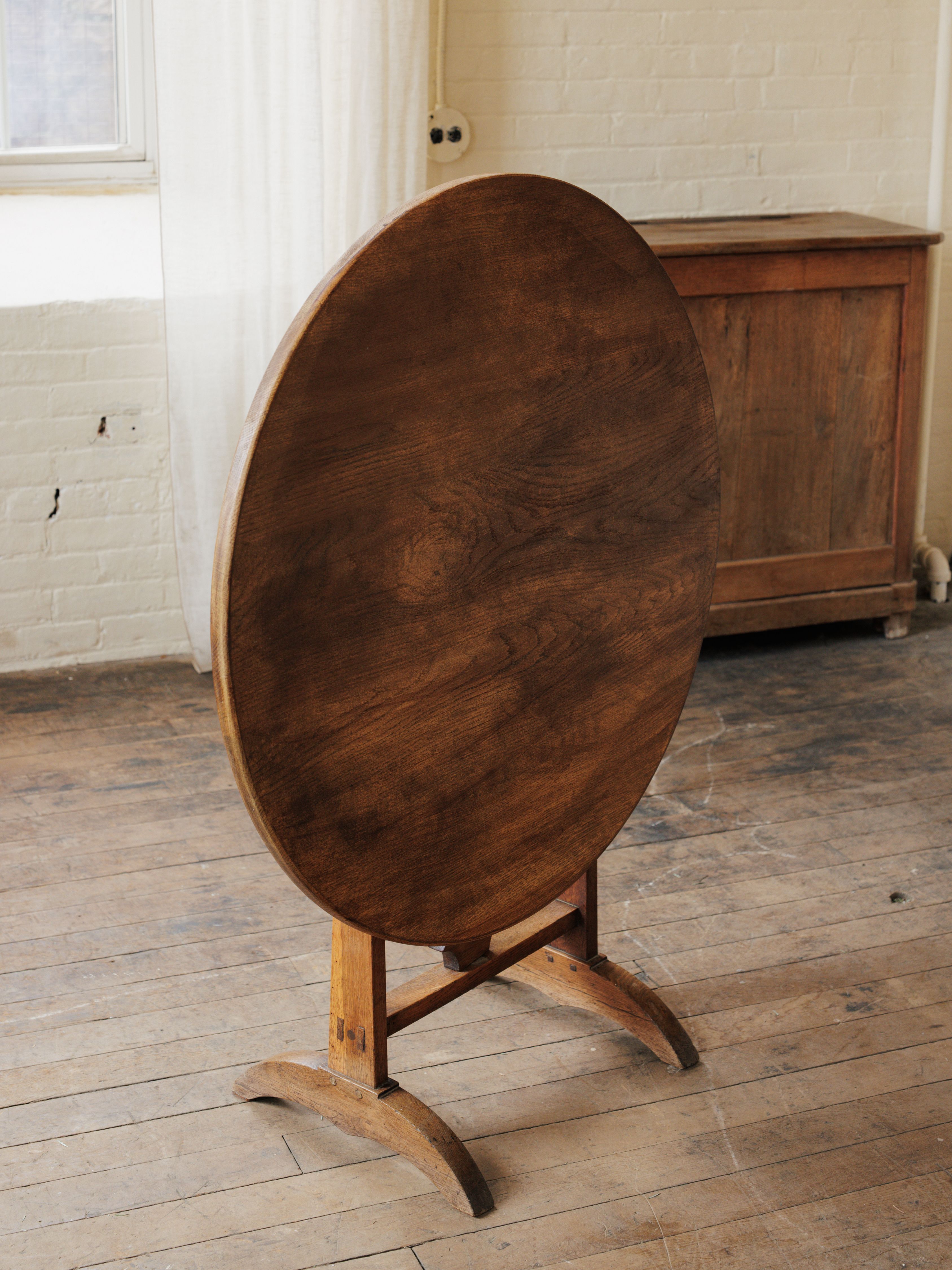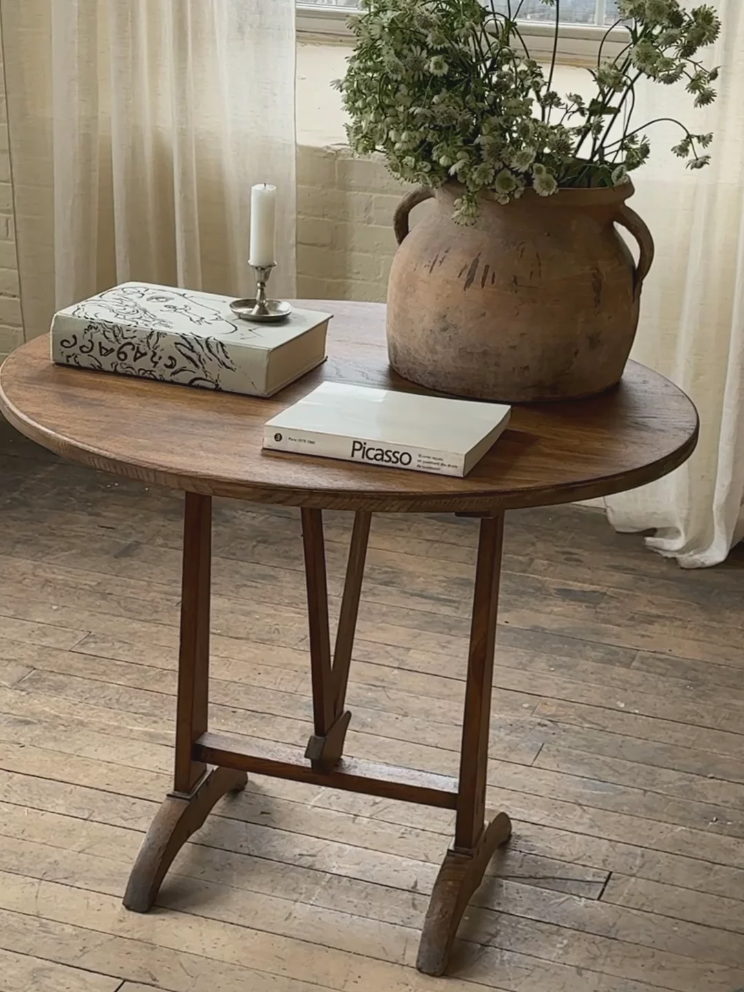 This early 1900s French wine tasting table, found in the Aix-en-Provence, is as clever as it is charming. With a beautifully worn round top and an ingenious folding mechanism, it was designed for easy storage in bustling wineries. Once used to sample wines straight from the barrel, it’s now ready to be your kitchen, dining or entryway table.