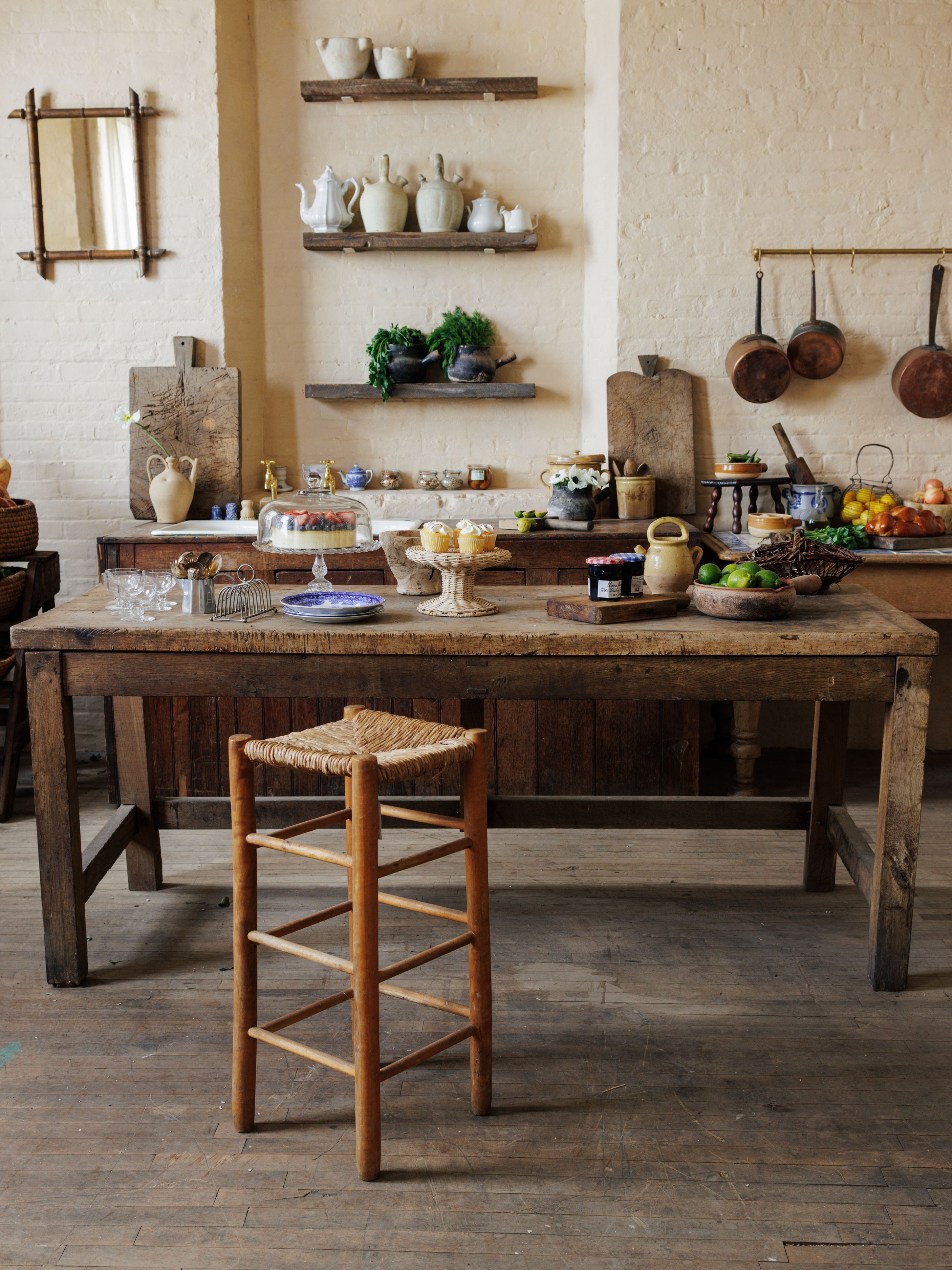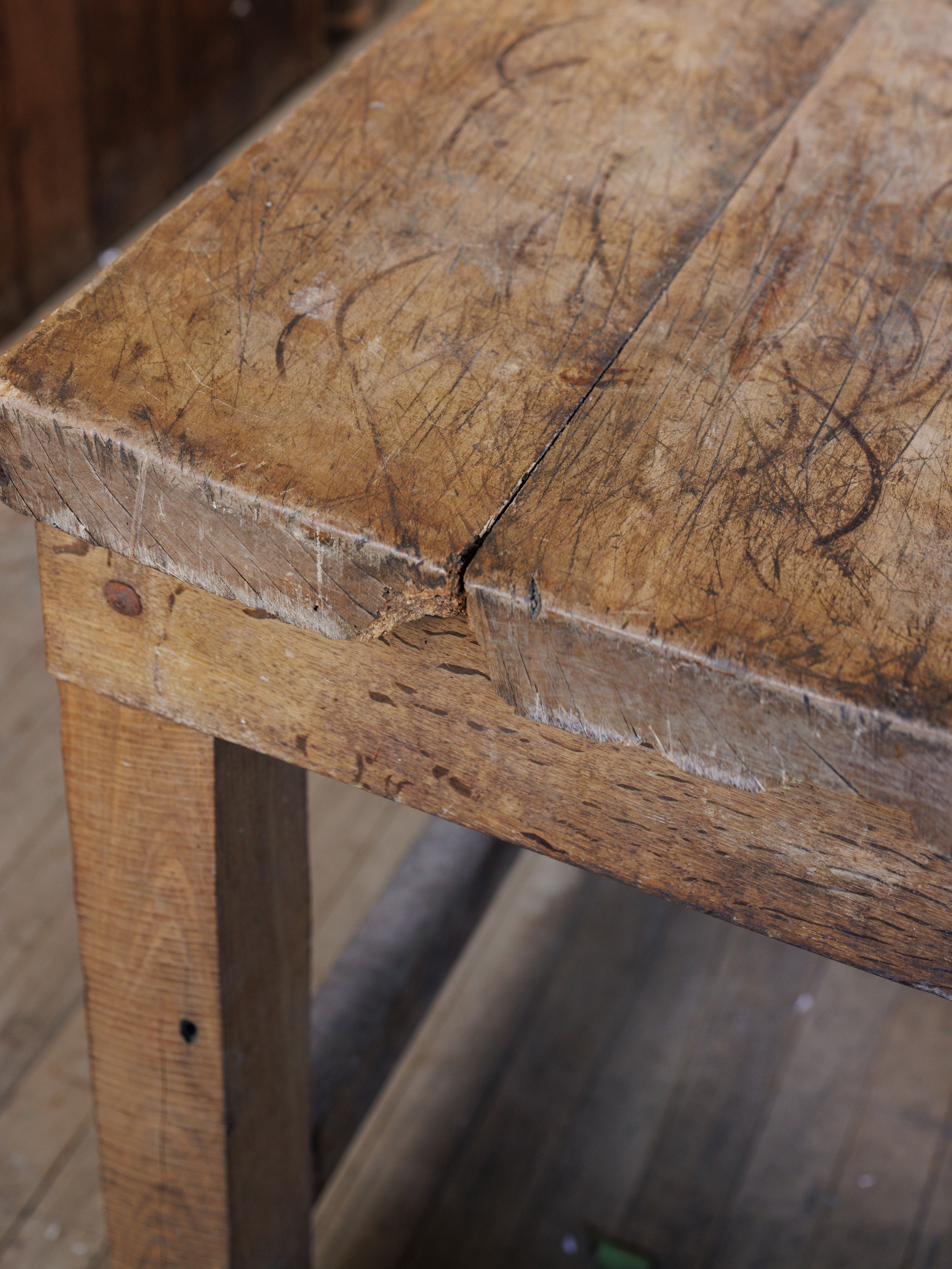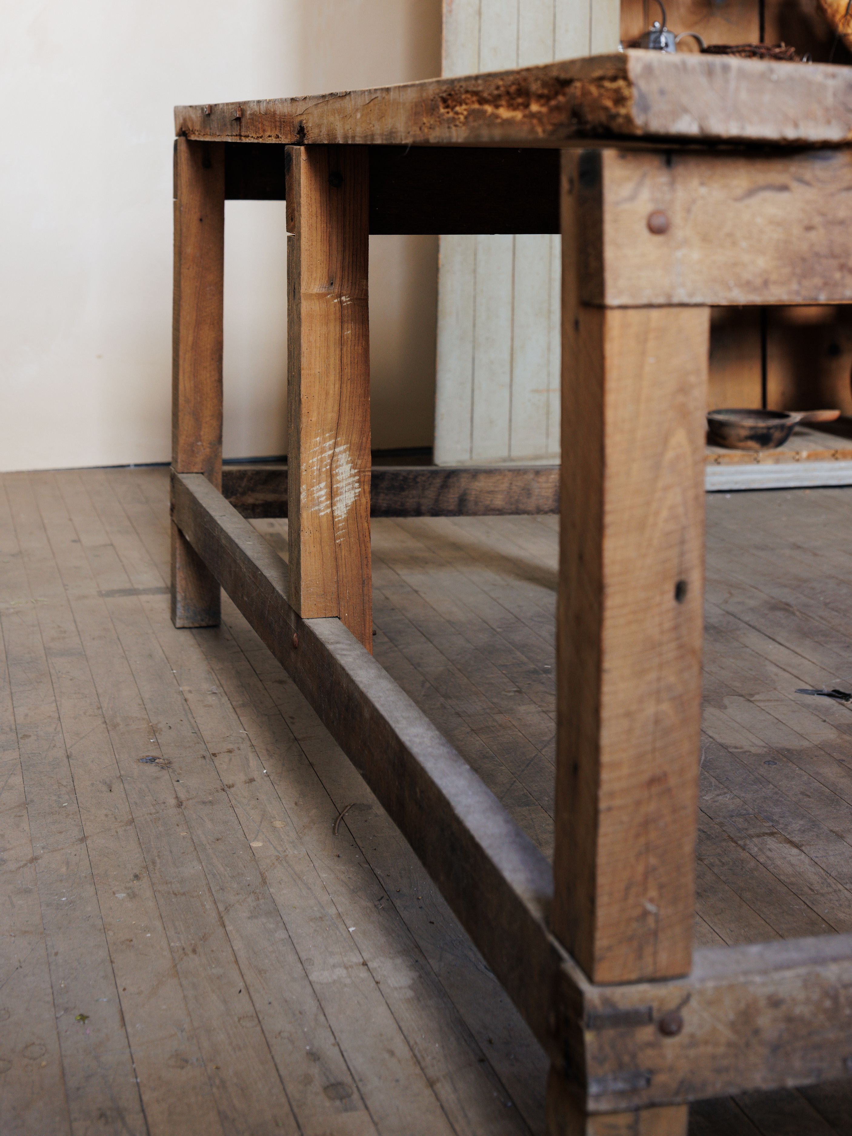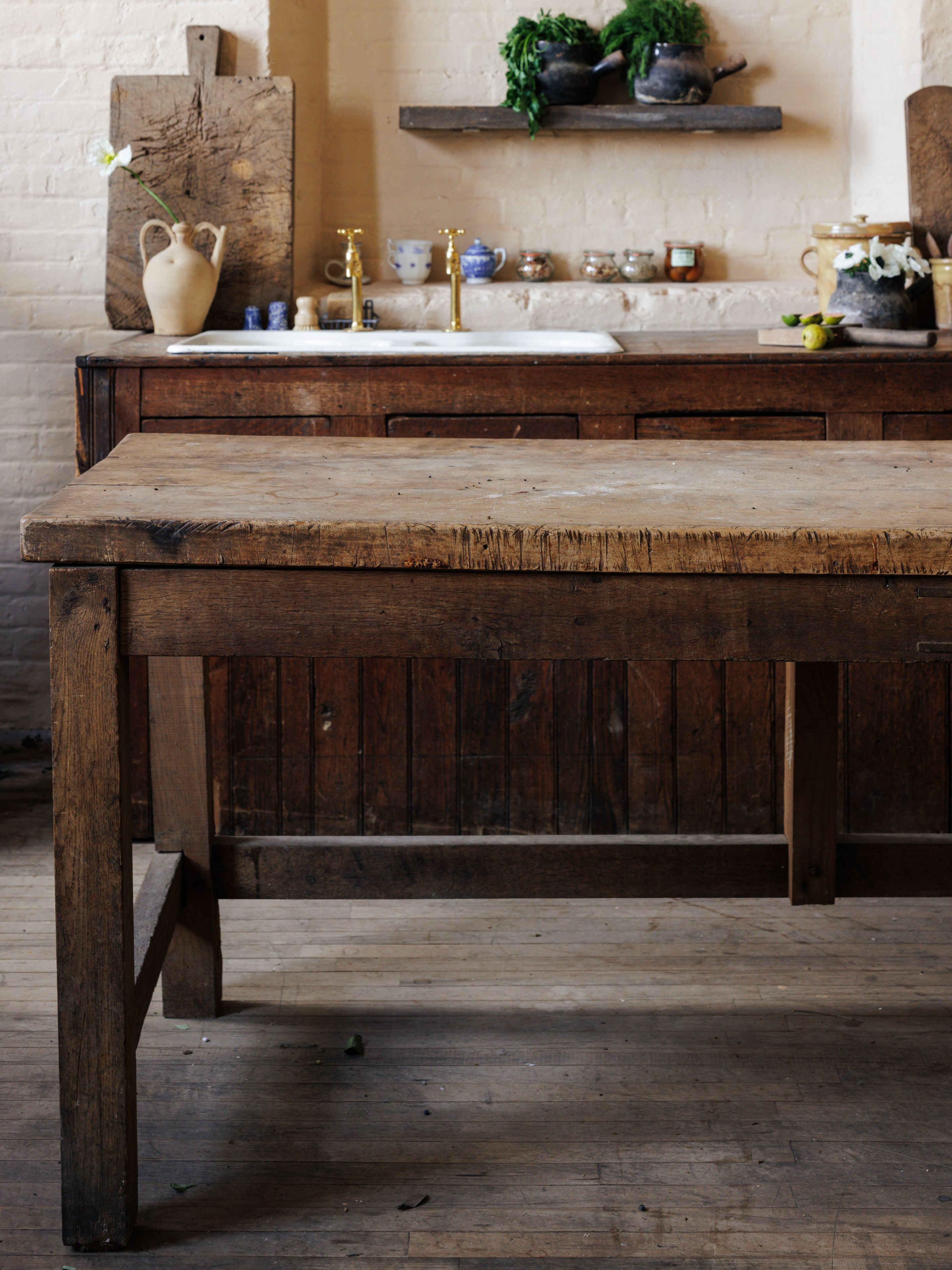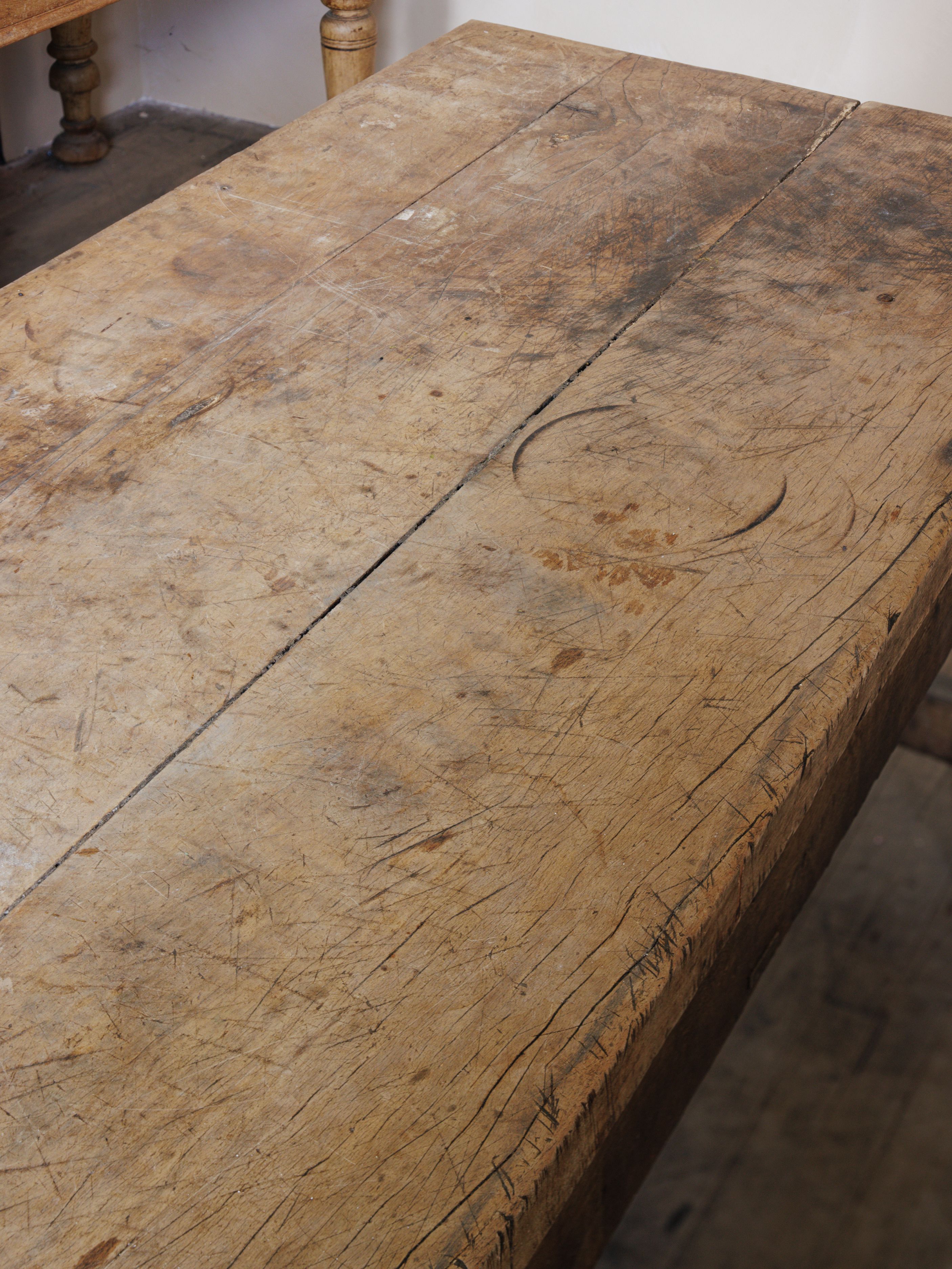 Found in Avignon, this French kitchen farm table has put in the work. Deep knife cuts, softened edges, a patina that only comes from decades of daily use—kneading dough, prepping vegetables, gathering for long meals that stretch into the night. Its sturdy frame and thick plank top were built to last, and it’s not done yet. The kind of table that makes a kitchen feel like home - honest, hardworking, and always ready for what’s next.