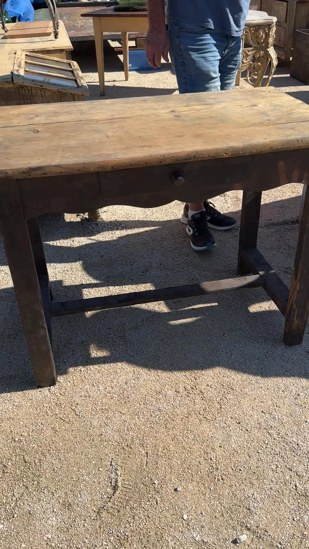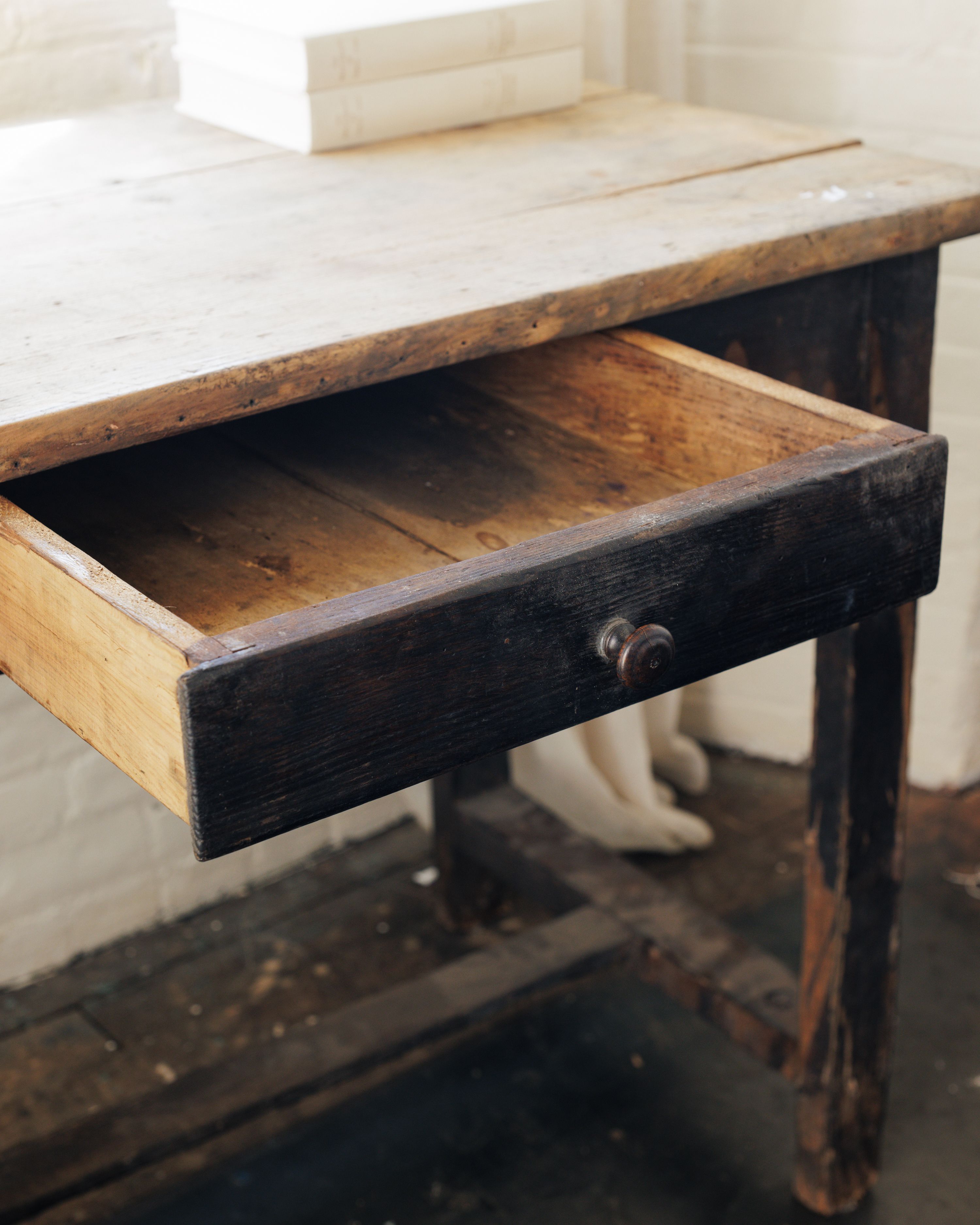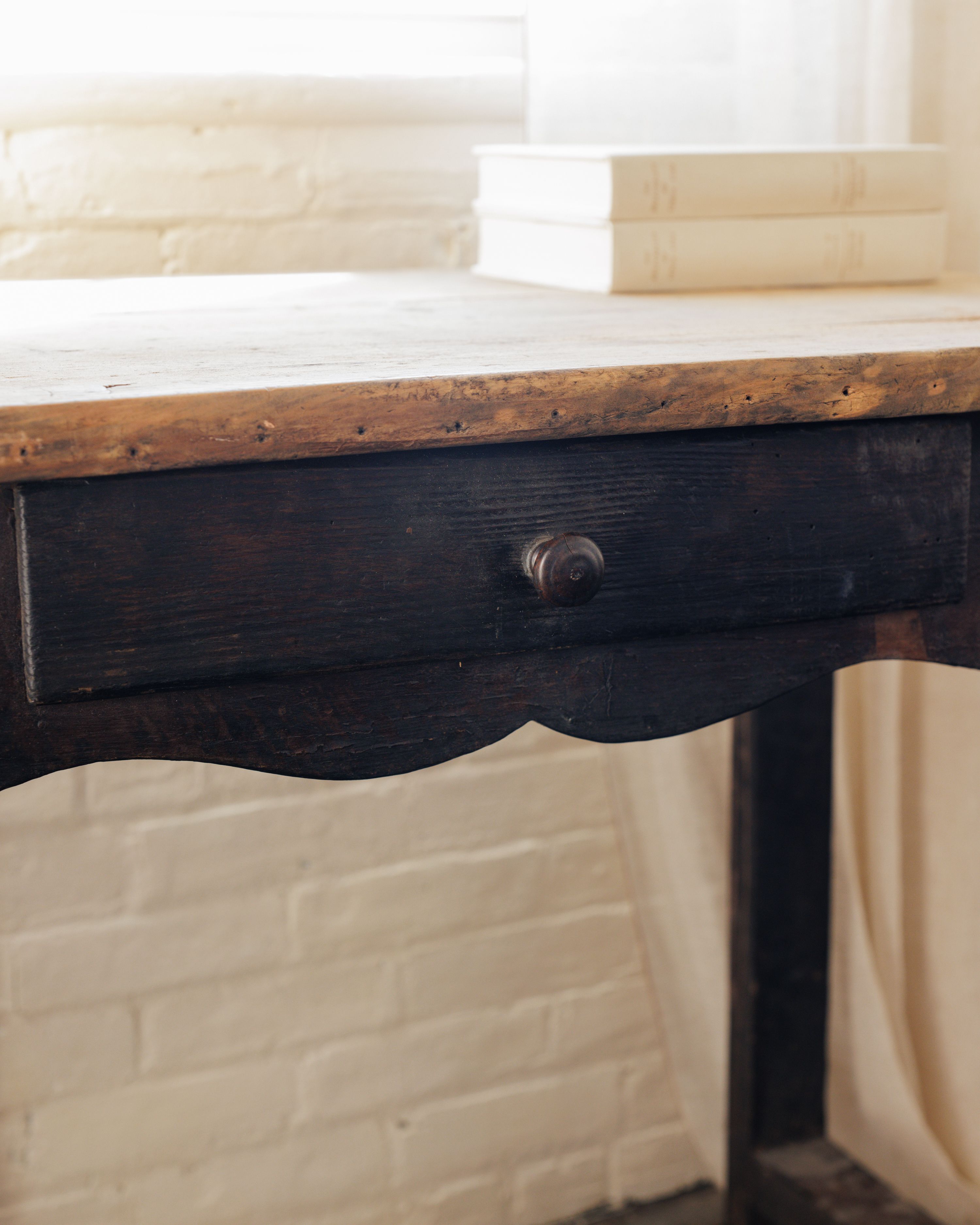A hardworking piece with a storied past, this 19th-century French desk once served as a kitchen table in Aveyron. Crafted from fir, its scalloped apron and timeworn black finish hint at generations of use. The small drawer offers just enough space for writing essentials or treasured keepsakes, making it a perfect fit for a quiet writing nook or an elegant makeup table.