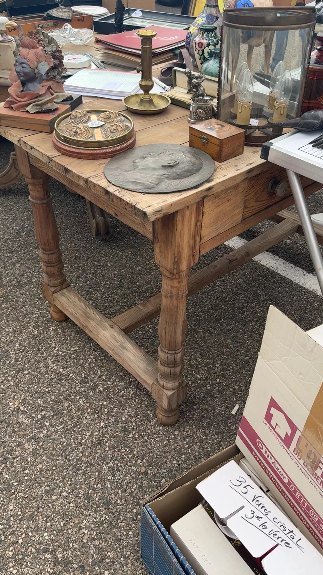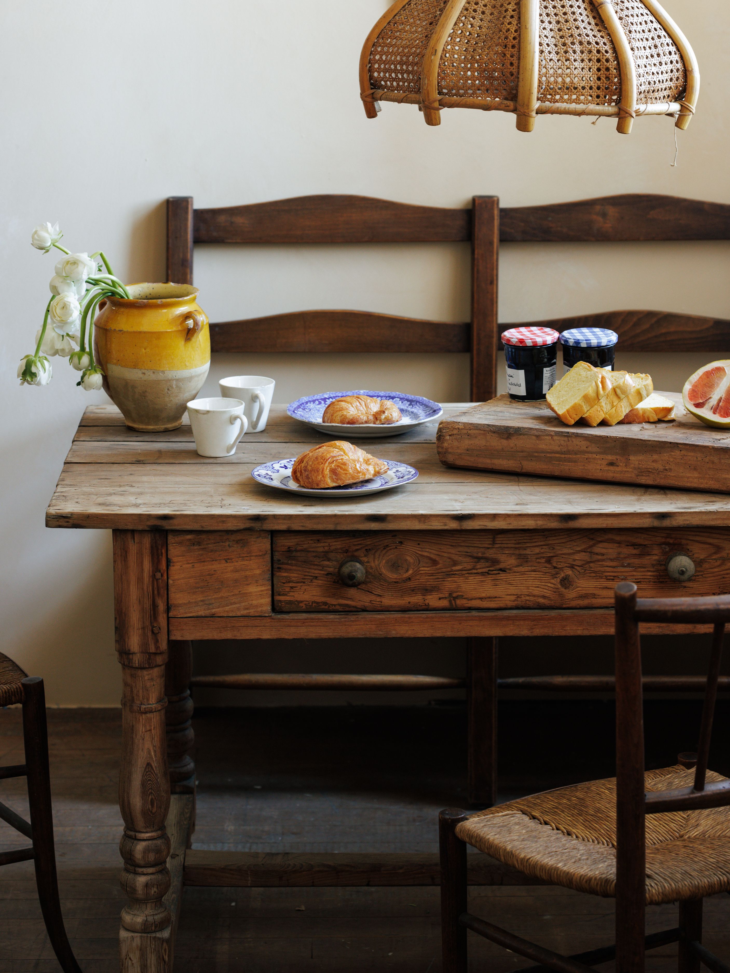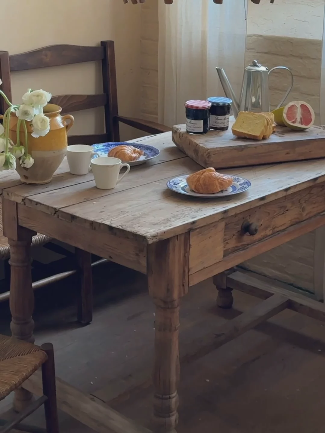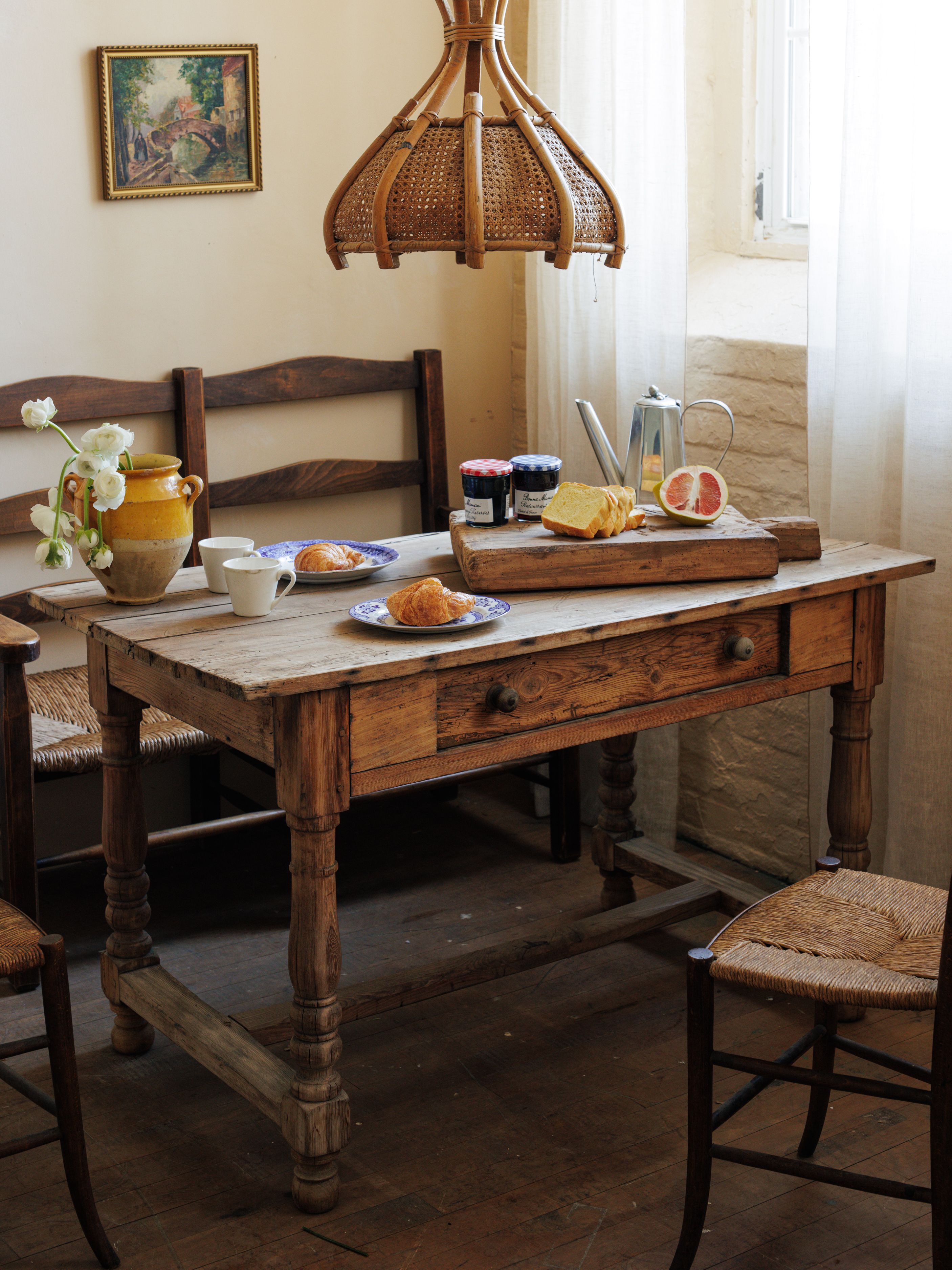 Found in Avignon, this French breakfast table was pulled straight from a crumbling château kitchen, its history etched into every softened edge and worn drawer pull. Stripped back to its raw wood, the grain is rich, the surface marked by years of meals, conversation, and quiet morning rituals. The turned legs are handcarved, while the deep drawer is perfect for tucking away linens, cutlery, or the little things that never seem to have a place. It’s the kind of table that works just as well for long breakfasts as it does for late-night emails, a serving station, or a spot to gather with a bottle of wine.
