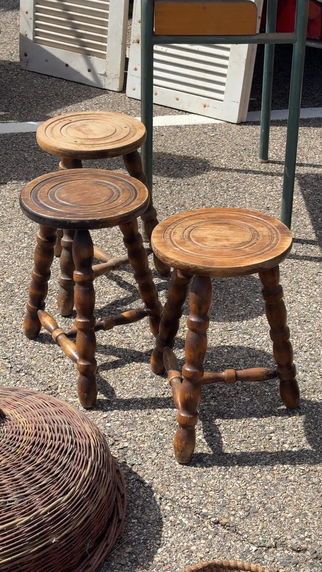 These adorable mid-century French tripod stools, were discovered in Villeneuve-lès-Avignon. Made from solid wood with a sturdy design, they carry the charm of Provençal craftsmanship. A perfect accent piece, whether as a small side table or as a minimal nightstand. Each stool is picked by Sylvie and you should expect variations in signs of wear including texture, coloration, markings, and minor imperfections.