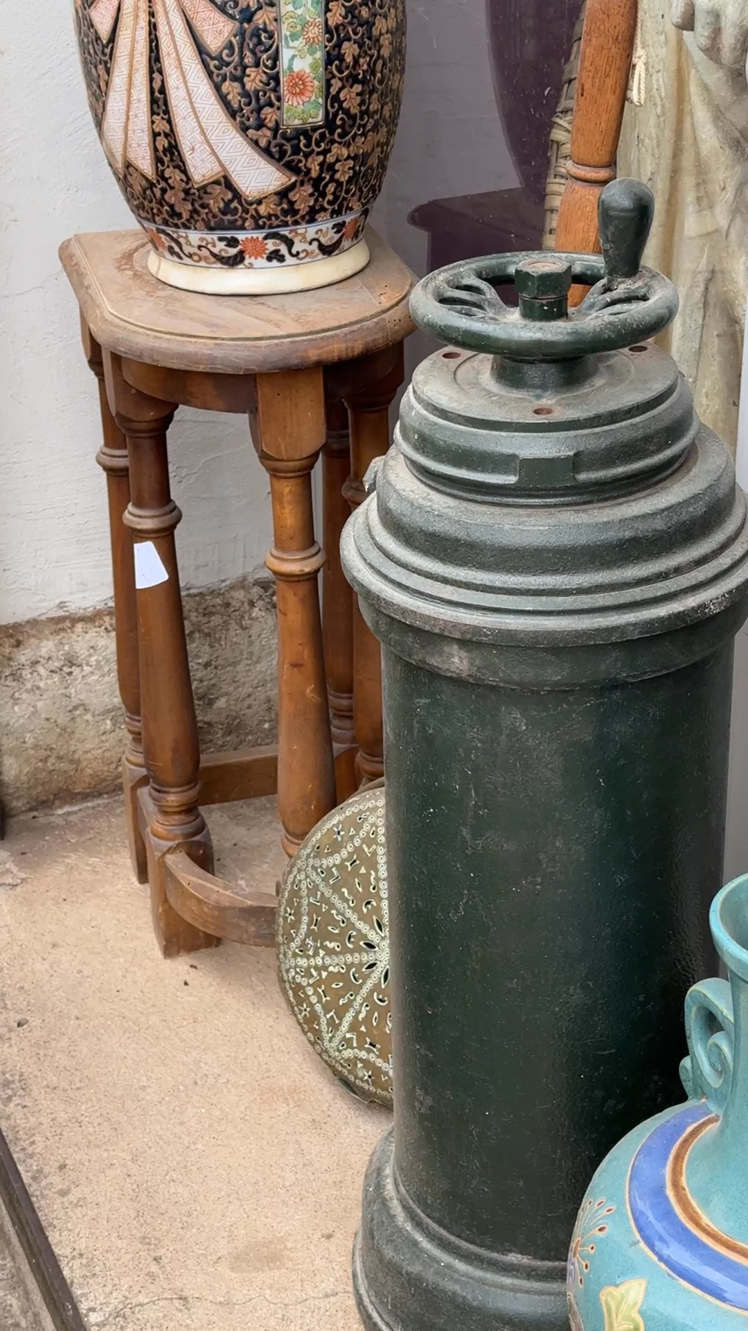 This antique cantor table is a rare and extraordinary find. With its unique demi-lune shape and five elegantly crafted legs, it commands attention without saying a word. The stool reveals decades of wear, showcasing a stunning patina that only time can create. Once used by cantors during church services, it carries a quiet sense of history and purpose.
