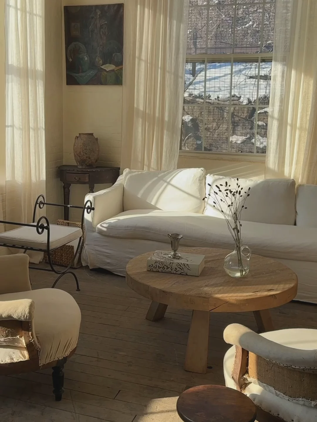 Found in Pézenas, this stunning round oak coffee table is the kind of piece you don’t come across twice. The thick, solid oak top is pieced together with hand-cut joinery - functional, precise, and a quiet nod to the kind of craftsmanship that doesn’t cut corners. The legs are wide and angled, giving it a weighty, Brutalist presence. The wood has softened over time, its grain running deep with natural imperfections that only add to its character. To say we are obsessed is an understatement.